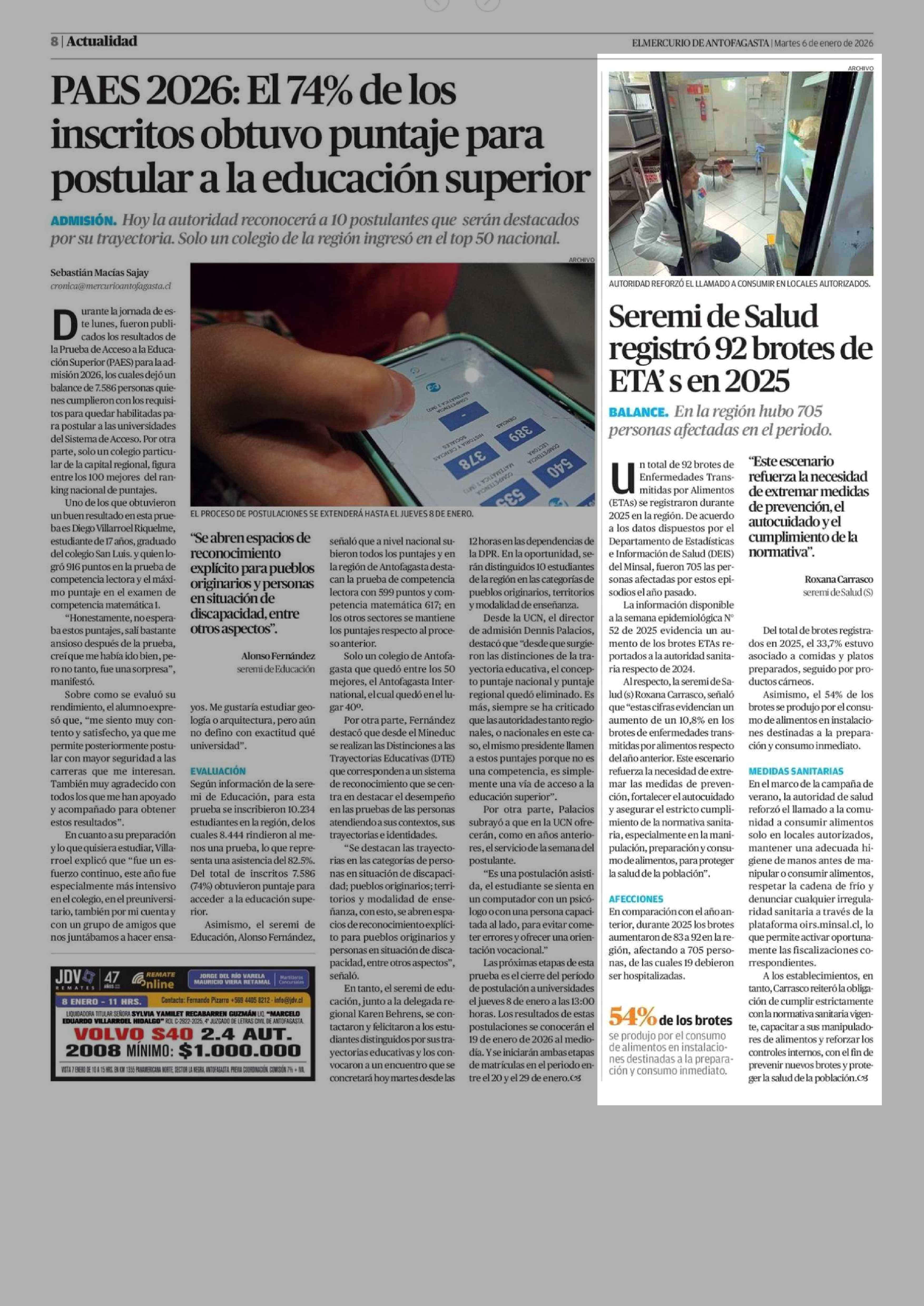 Seremi de Salud registró 92 brotes de ETA' s en 2025 06-01-2026 El Mercurio de Antofagasta |