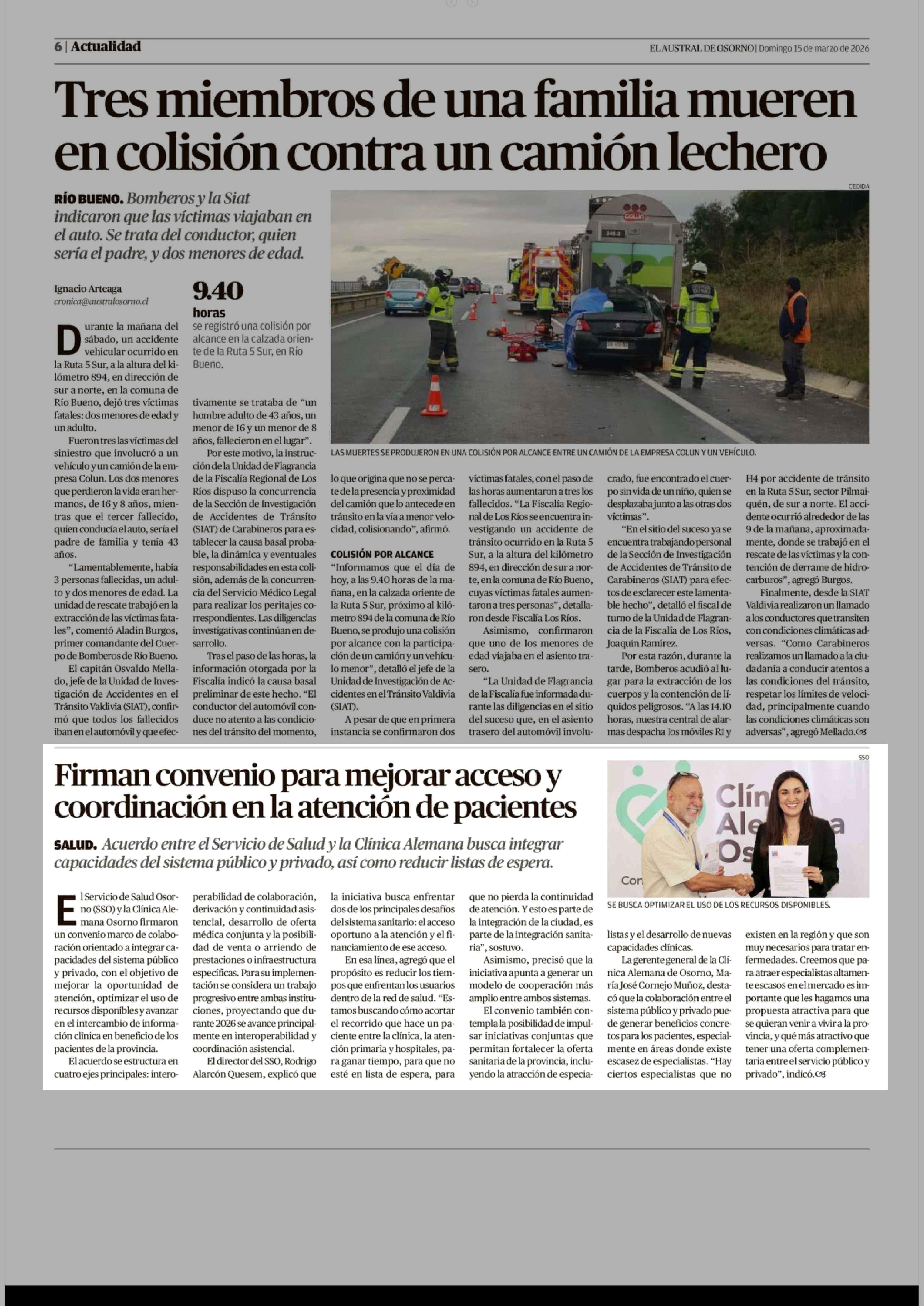 Firman convenio para mejorar acceso y coordinación en la atención de pacientes 15-03-2026 El Austral de Osorno |