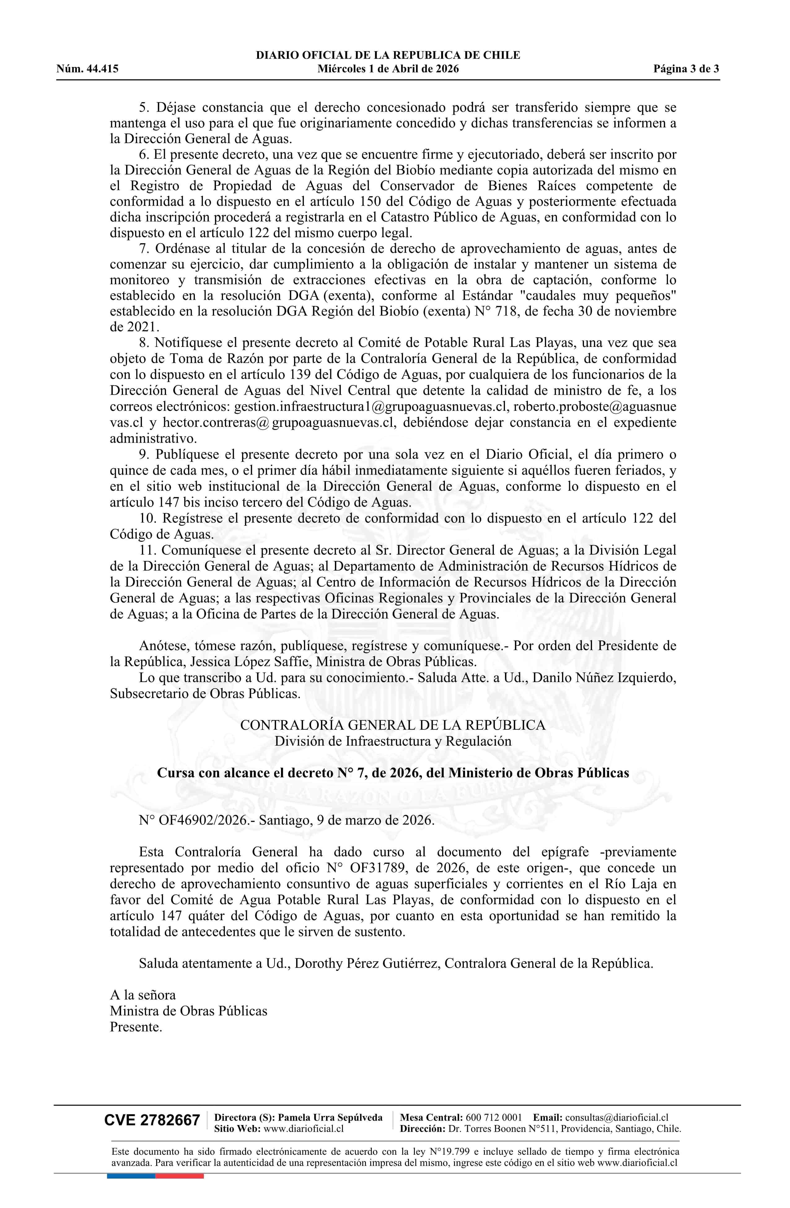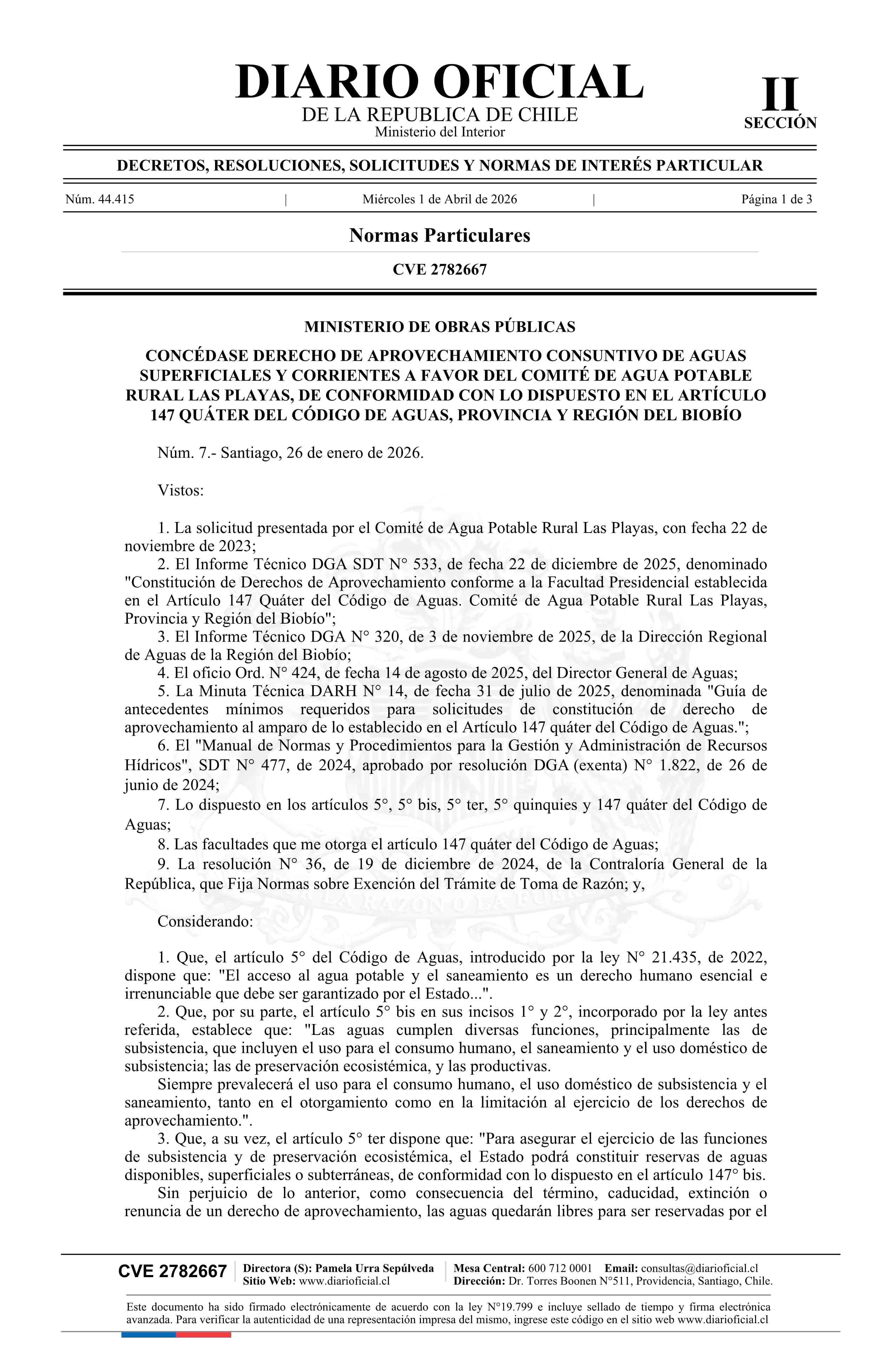 Título: Decreto número 7, de 2026.- Concede derecho de aprovechamiento consuntivo de aguas superficiales y corrientes a favor del Comité de Agua Potable Rural Las Playas, de conformidad con lo dispuesto en el artículo 147 Quáter del Código de Aguas, provincia y Región del Biobío