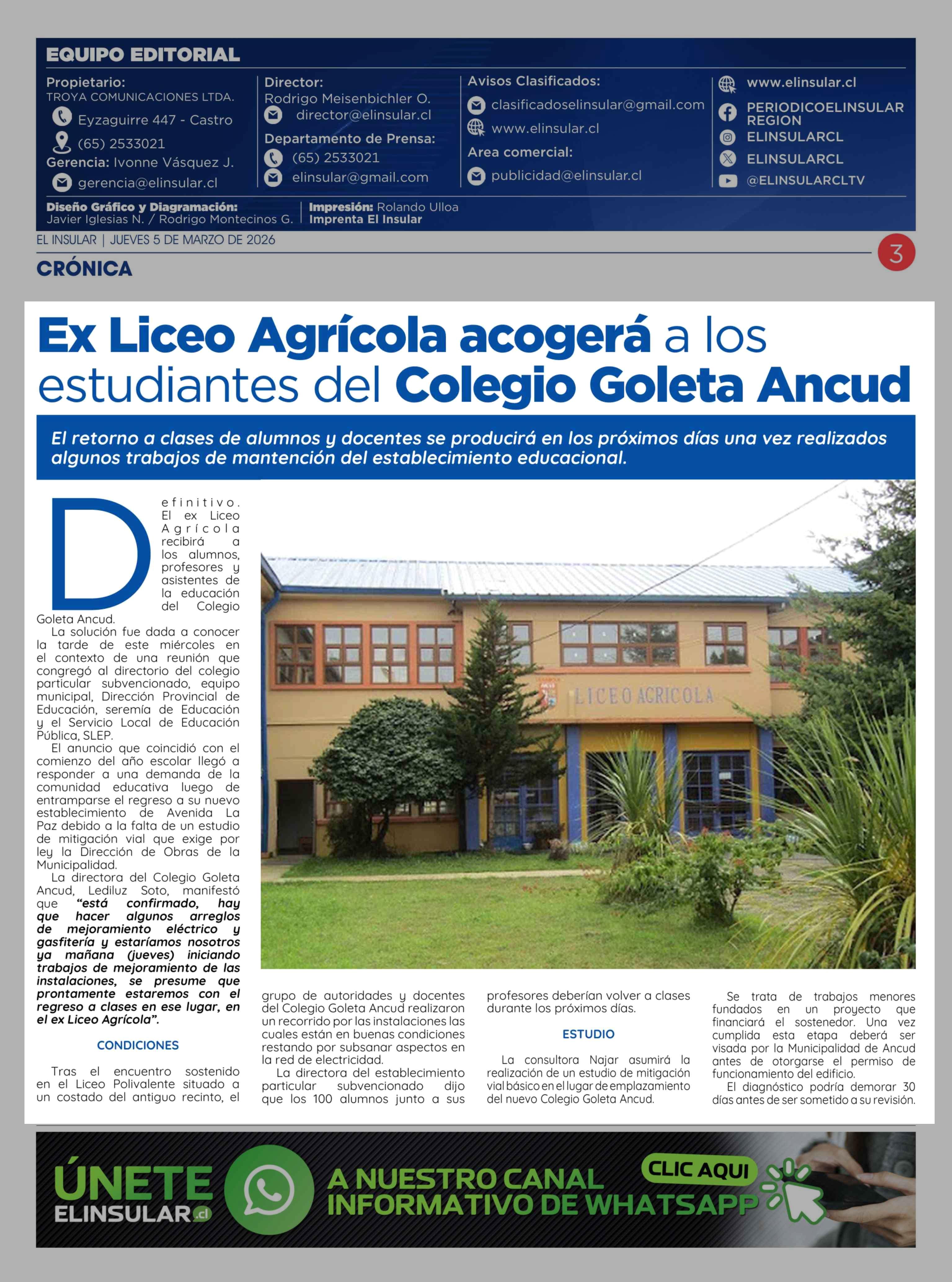 Ex Liceo Agrícola acogerá a los estudiantes del Colegio Goleta Ancud 05-03-2026 El Insular |