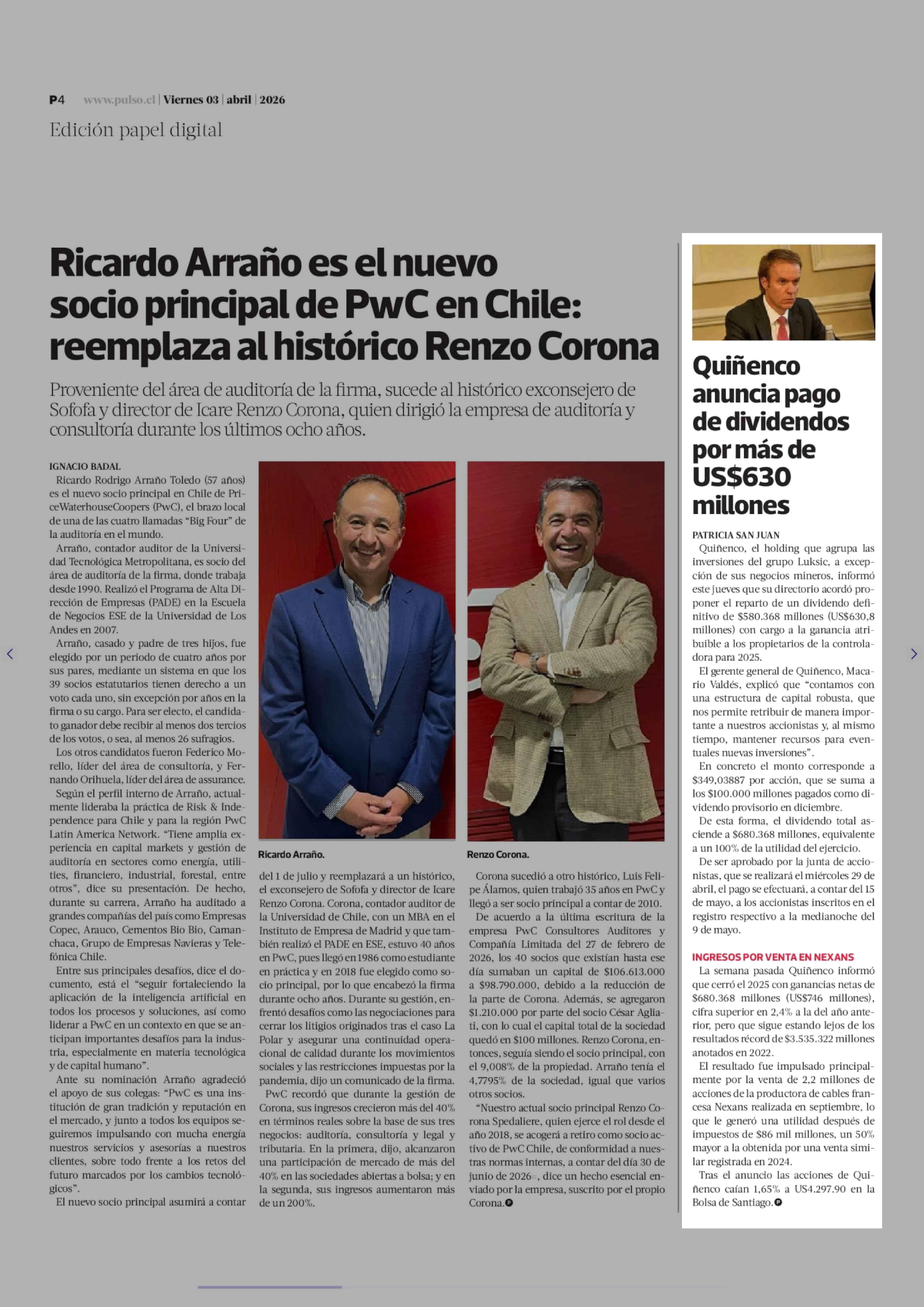 Quiñenco anuncia pago de dividendos por más de US$630 millones 03-04-2026 La Tercera |