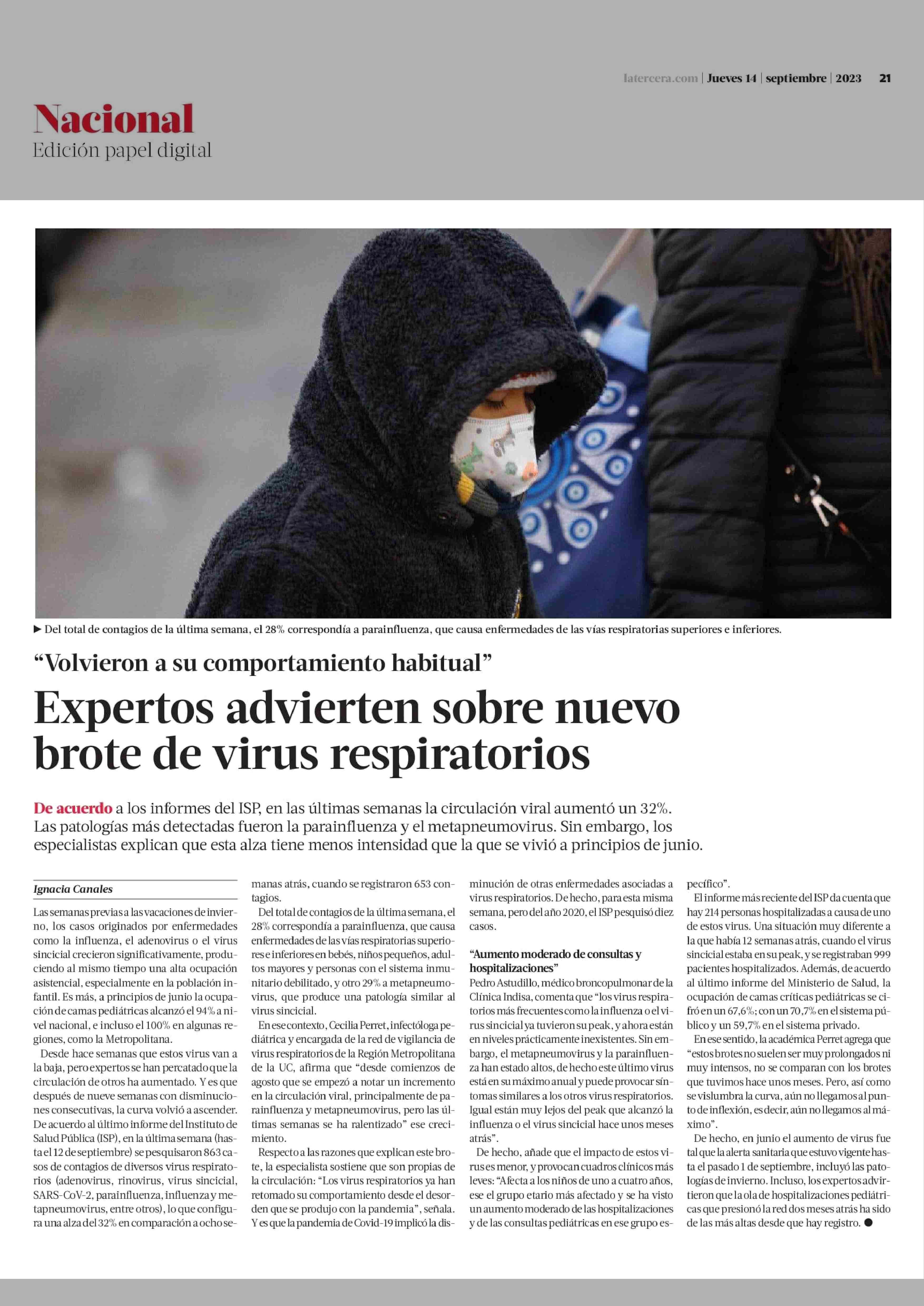 Expertos advierten sobre nuevo brote de virus respiratorios 14-09-2023 La Tercera |