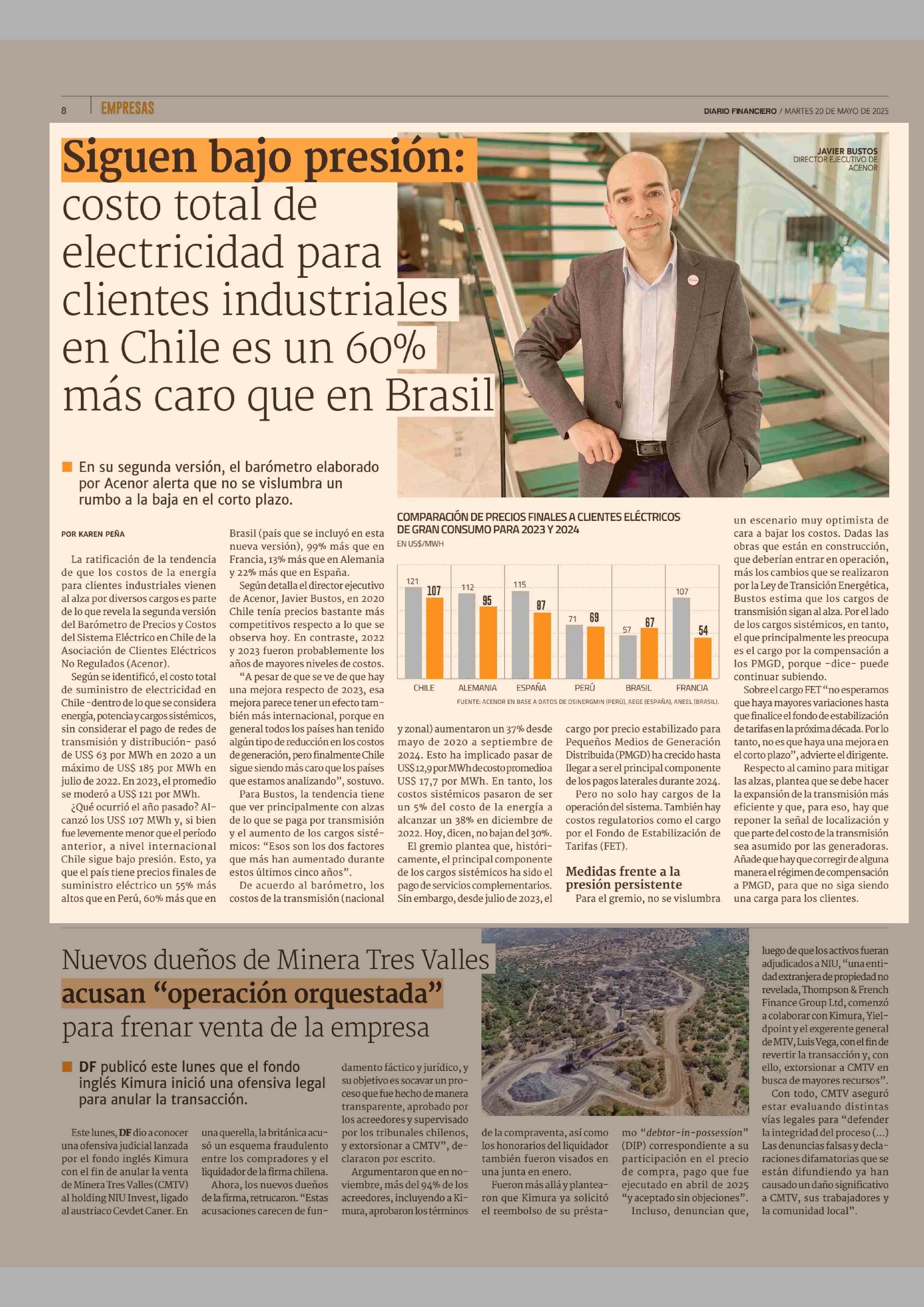 Siguen bajo presión: costo total de electricidad para clientes industriales en Chile es un 60% más caro que en Brasil 20-05-2025 Diario Financiero |