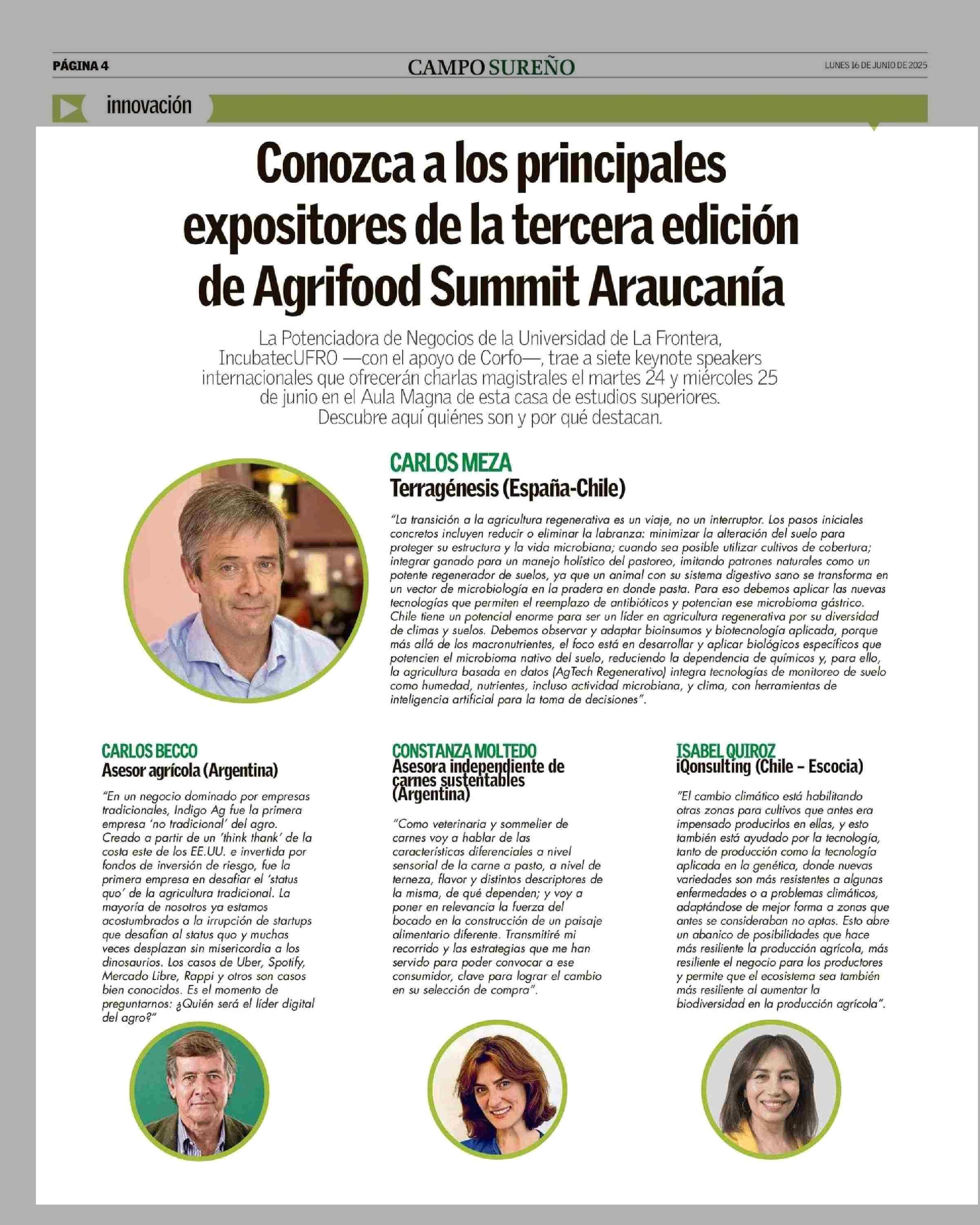 Conozca a los principales expositores de la tercera edición de Agrifood Summit Araucanía 16-06-2025 Campo Sureño - Regiones IX, X y XIV |