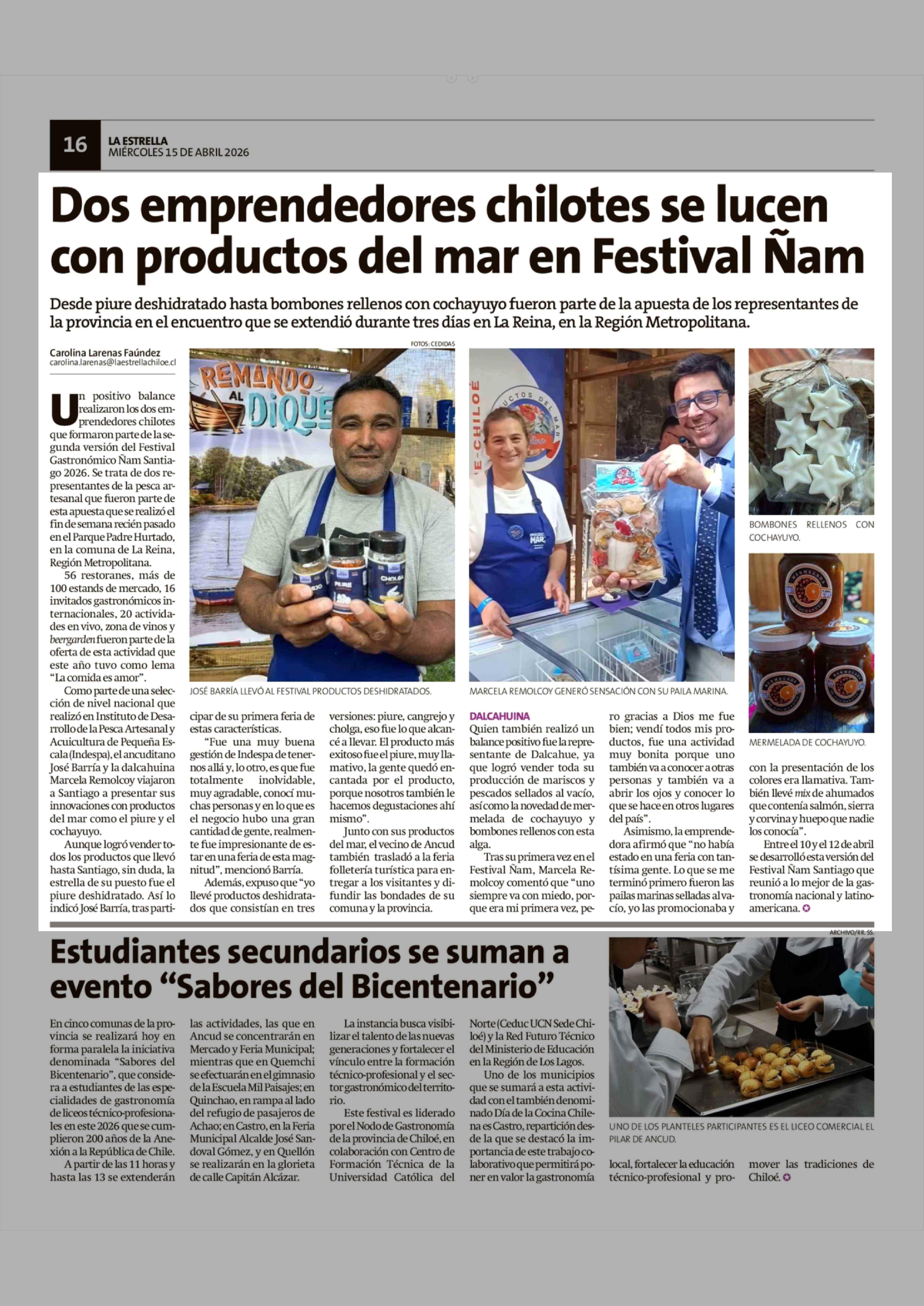 Dos emprendedores chilotes se lucen con productos del mar en Festival Nam 15-04-2026 La Estrella de Chiloé |