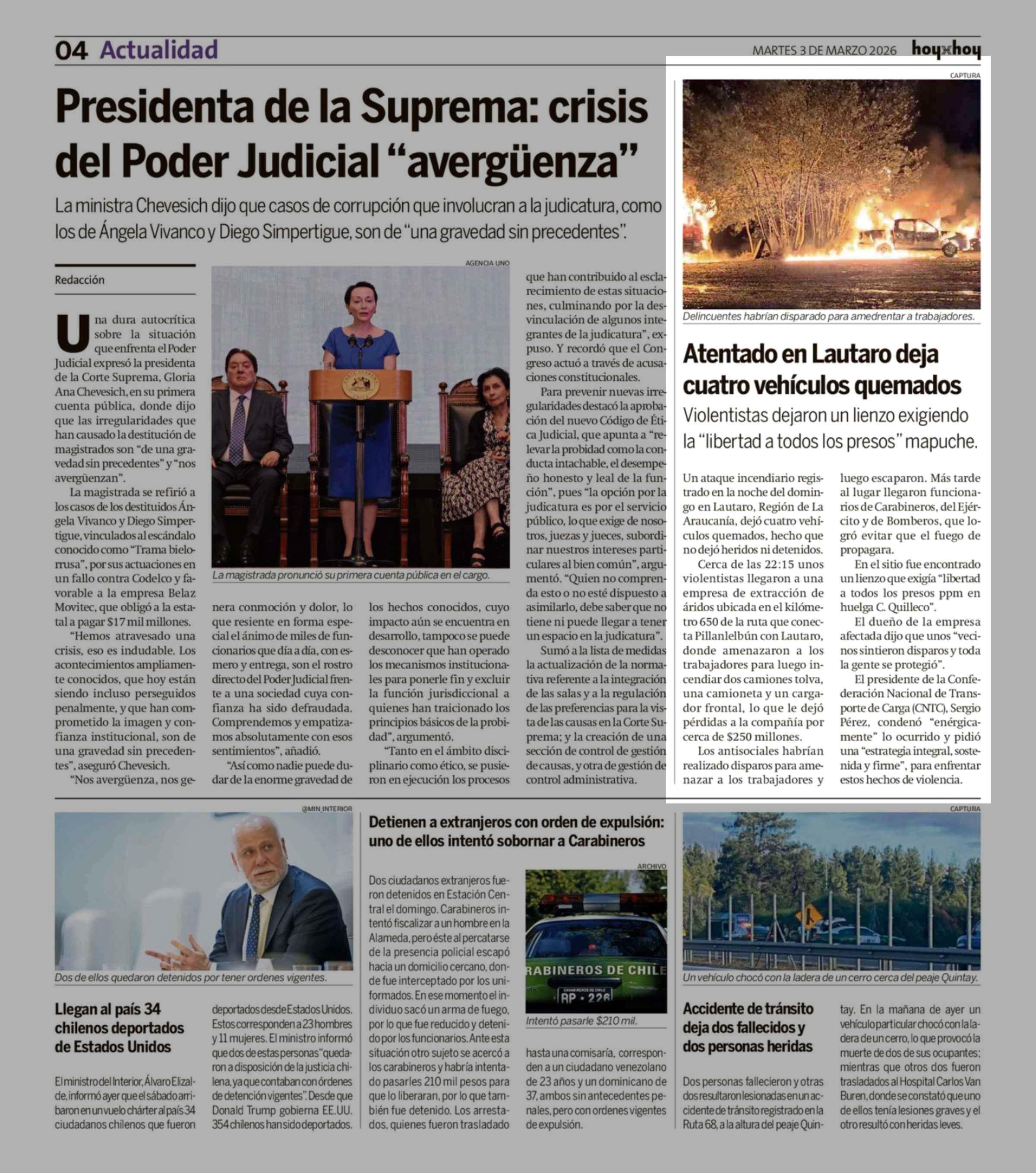 Atentado en Lautaro deja cuatro vehículos quemados 03-03-2026 Hoy x Hoy |