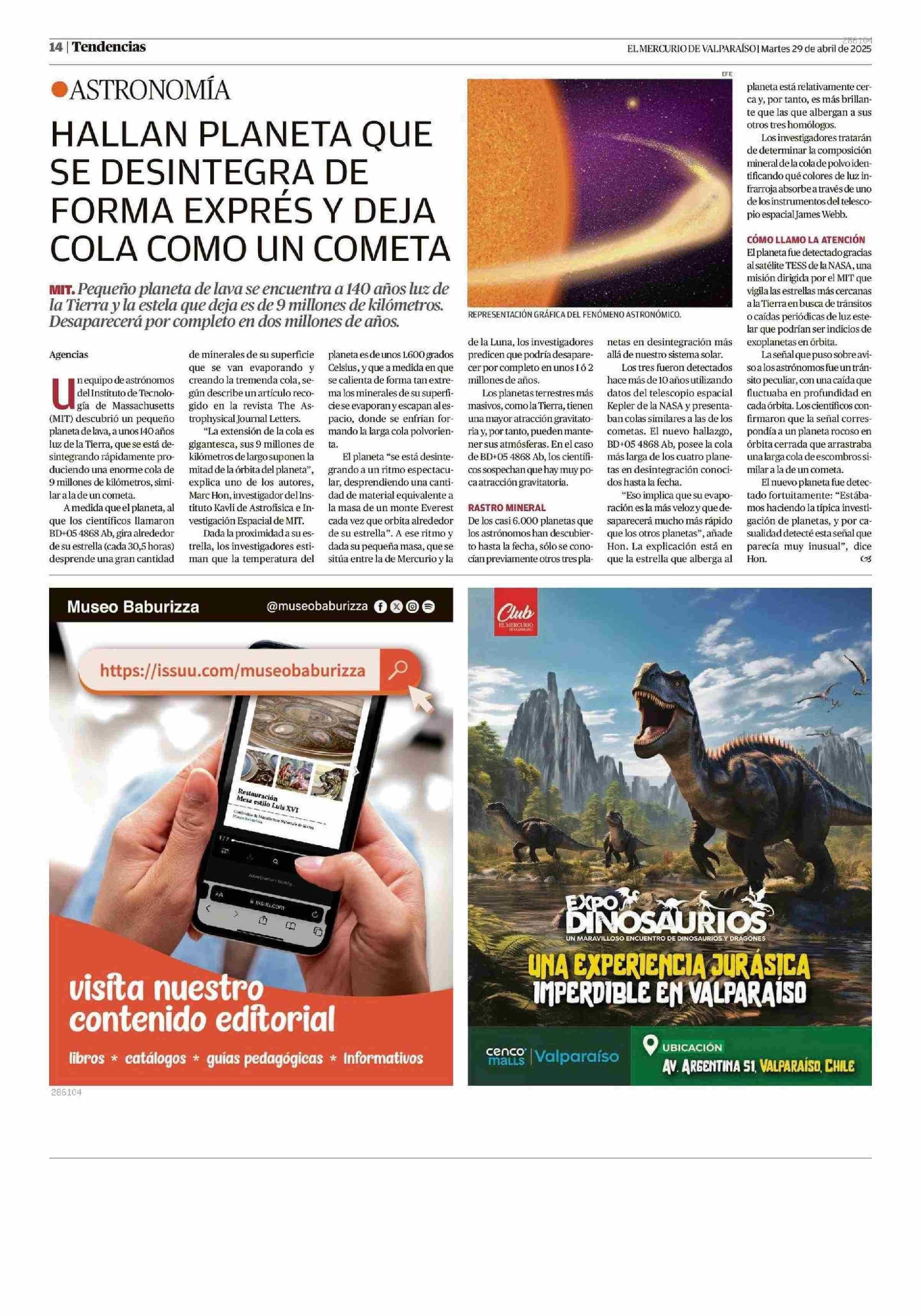 HALLAN PLANETA QUE SE DESINTEGRA DE FORMA EXPRES Y DEJA COLA COMO UN COMETA 29-04-2025 El Mercurio de Valparaíso |