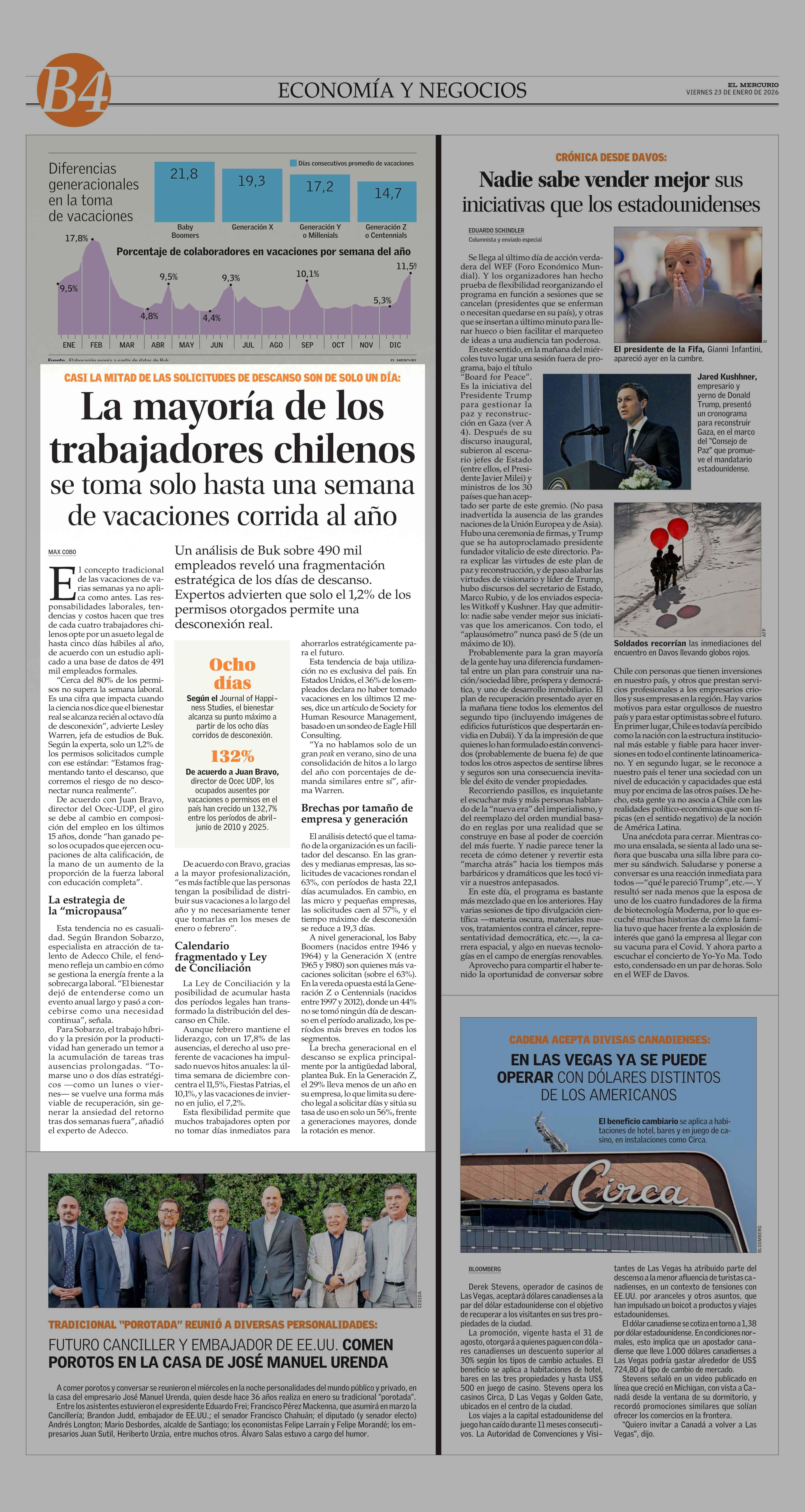 La mayoría de los trabajadores chilenos se toma solo hasta una semana de vacaciones corrida al año 23-01-2026 El Mercurio |