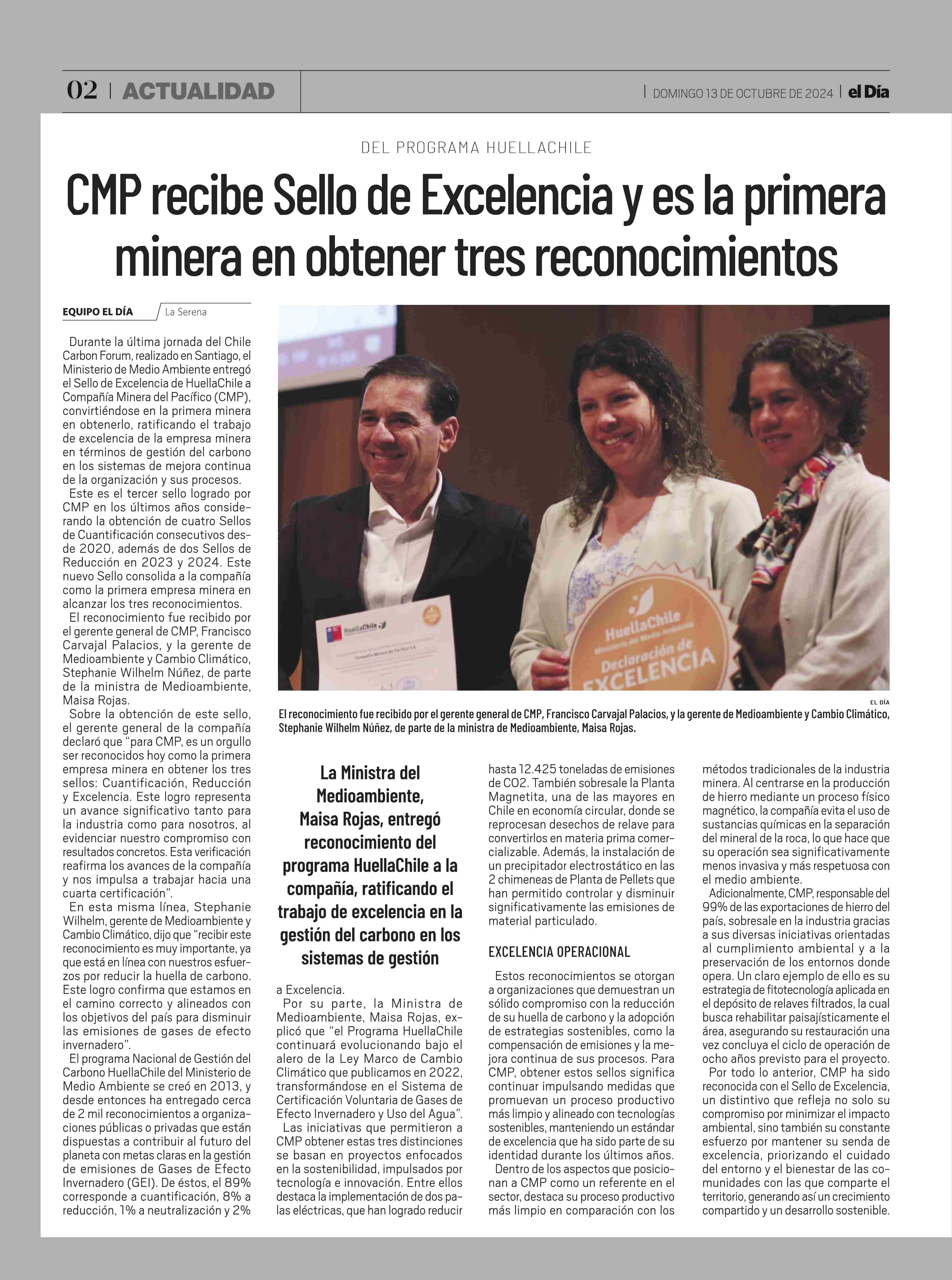 CMP recibe Sello de Excelencia y es la primera minera en obtener tres reconocimientos 13-10-2024 El Día |