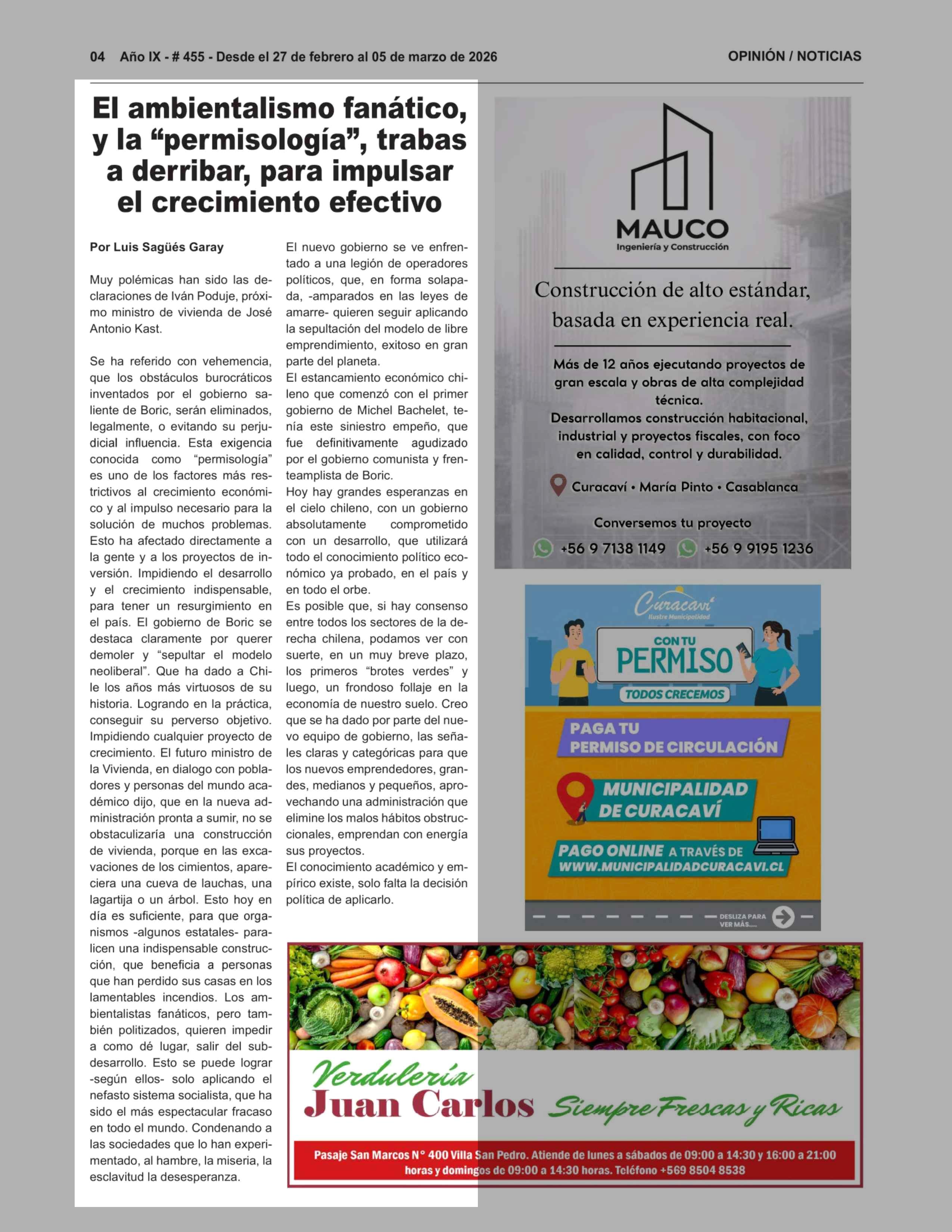El ambientalismo fanático, y la "permisología", trabas a derribar, para impulsar el crecimiento efectivo 27-02-2026 Buenos Días Curacaví |
