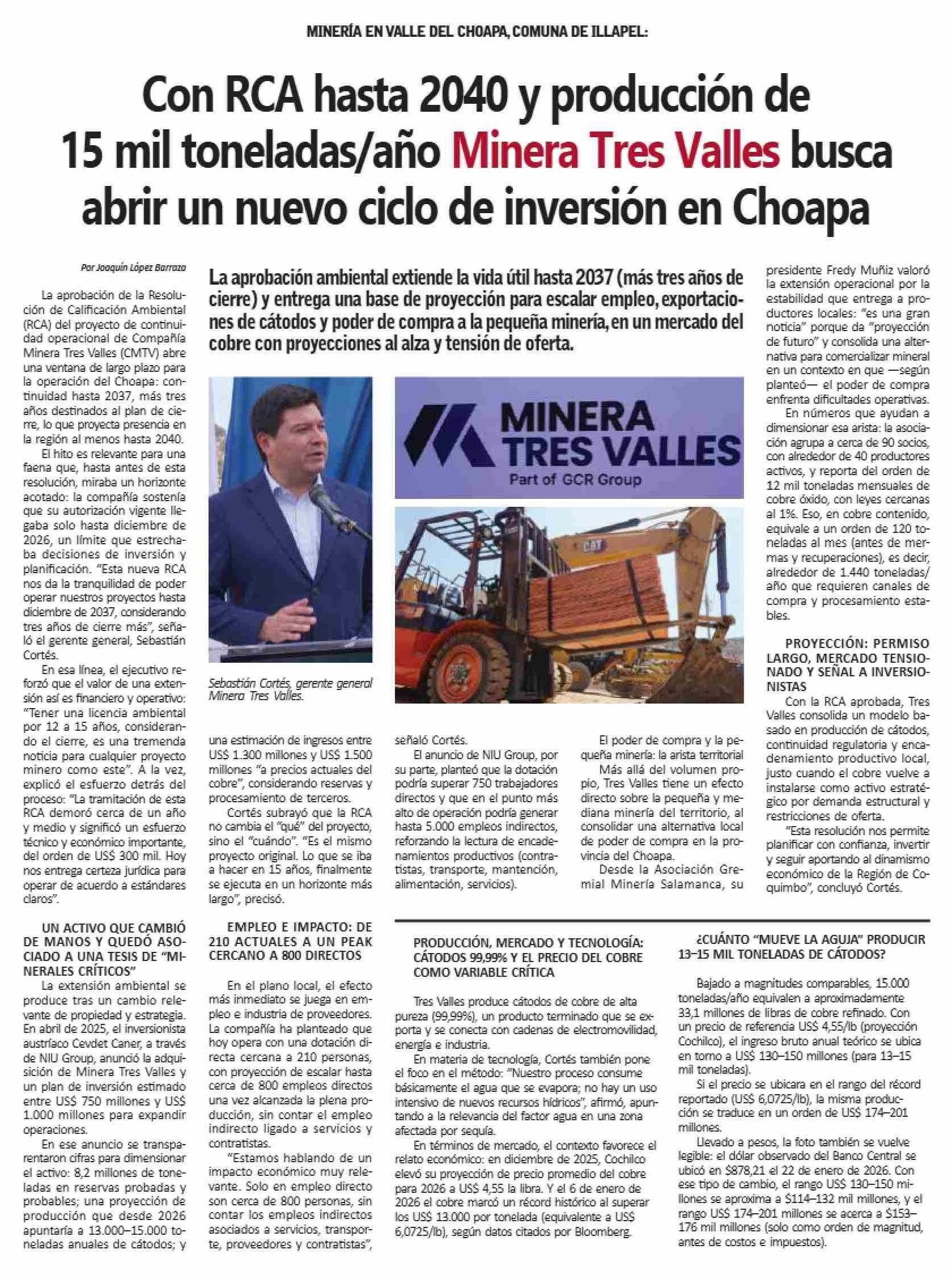 | Título: | Con RCA hasta 2040 y producción de 15 mil toneladas/año Minera Tres Valles busca abrir un nuevo ciclo de inversión en Choapa |