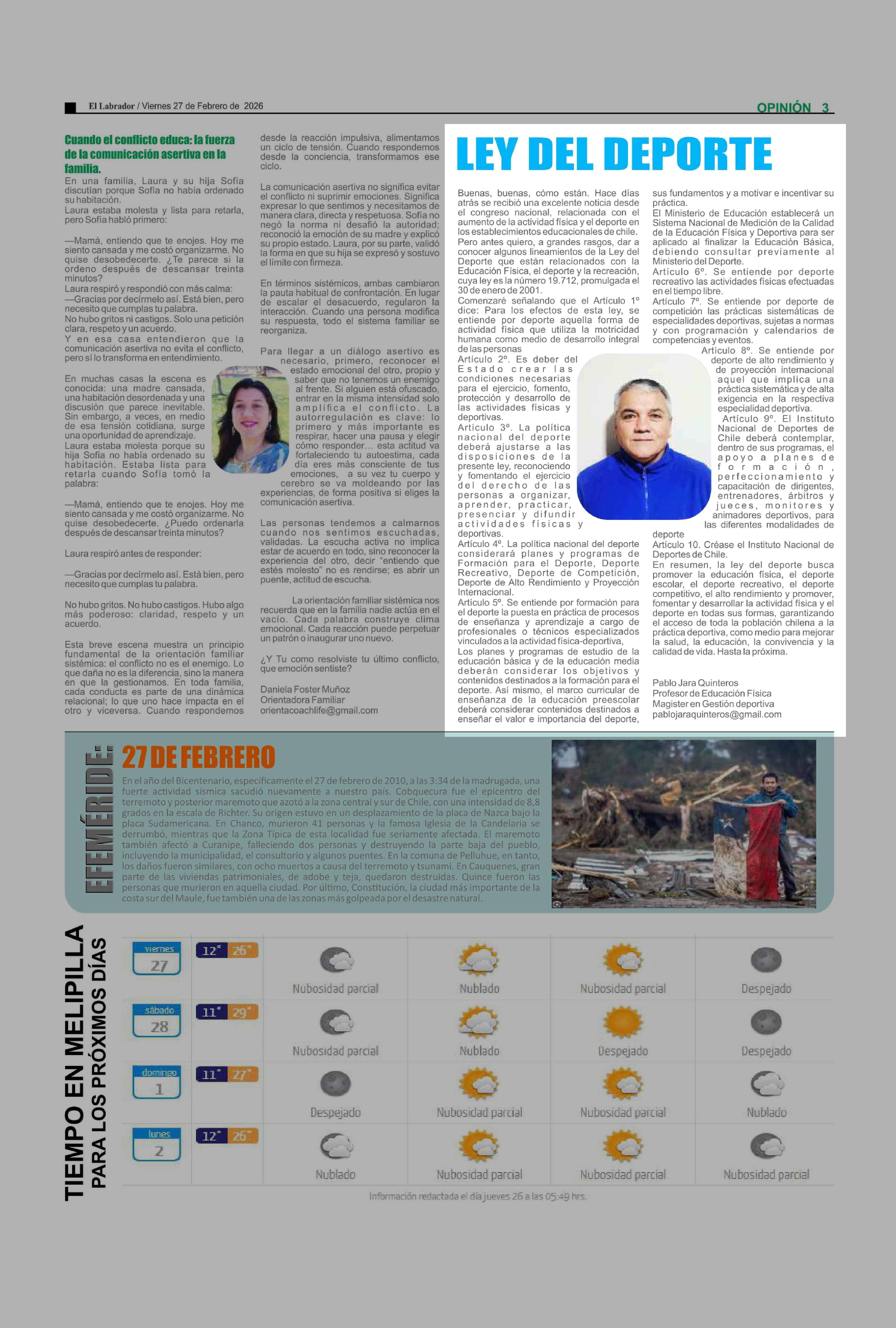 Columnas de Opinión: LEY DEL DEPORTE 27-02-2026 El Labrador |