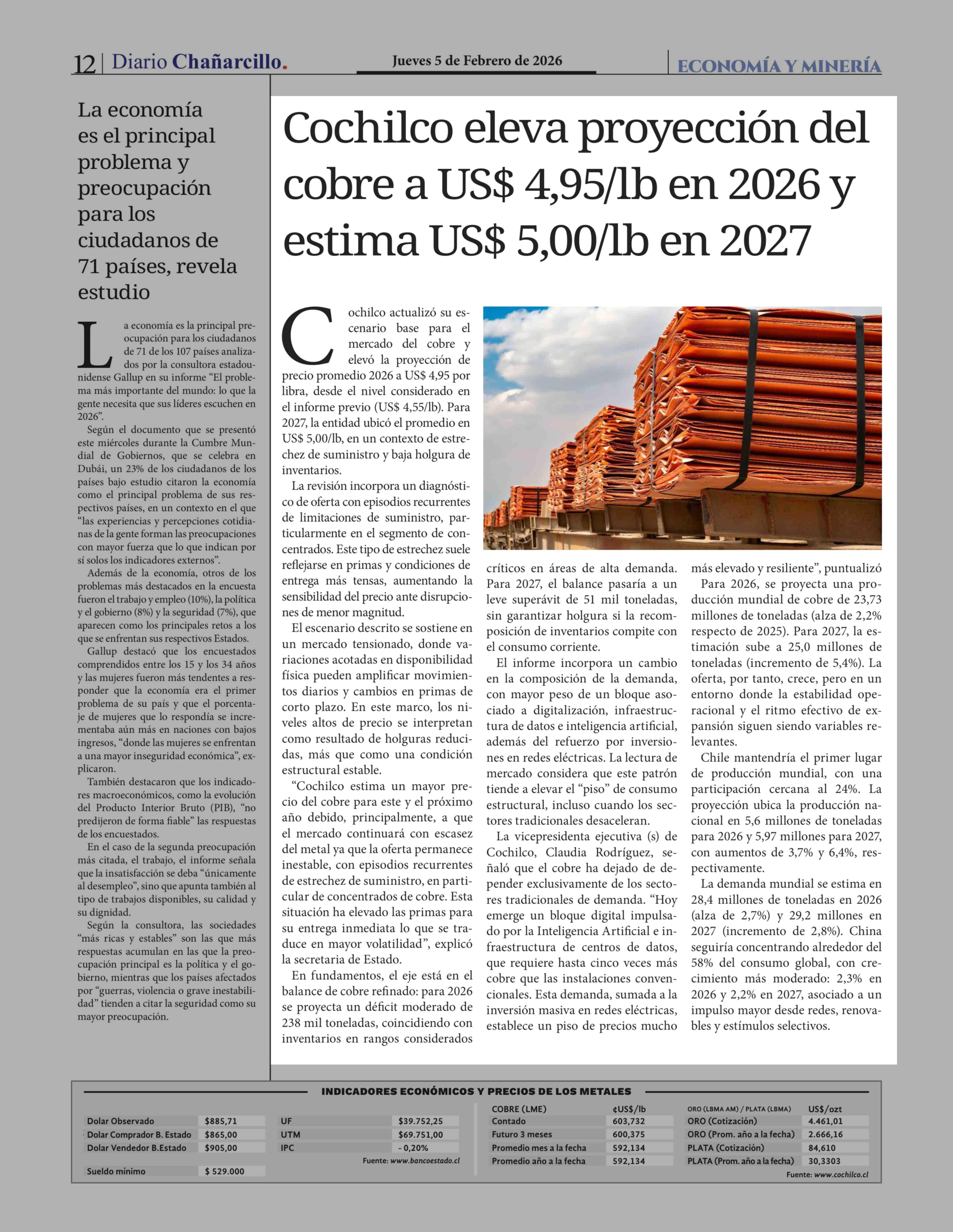 Cochilco eleva proyección del cobre a US$ 4,95/1b en 2026 y estima US$ 5,00/lb en 2027 05-02-2026 Diario Chañarcillo |
