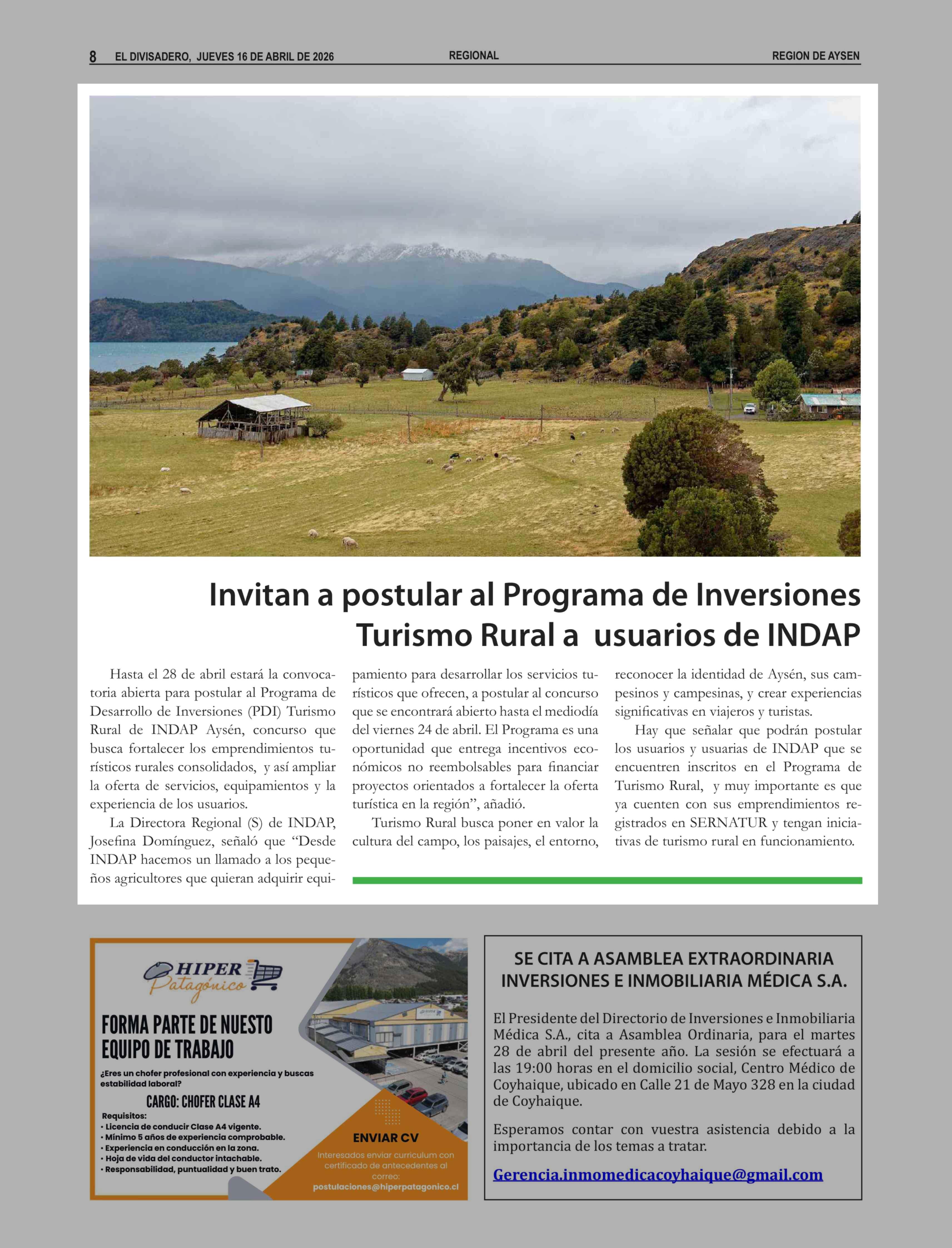 | Fecha: | 16-04-2026 | Sector: | Noticia general | Región: | Región Aysén del General Carlos Ibáñez del Campo |