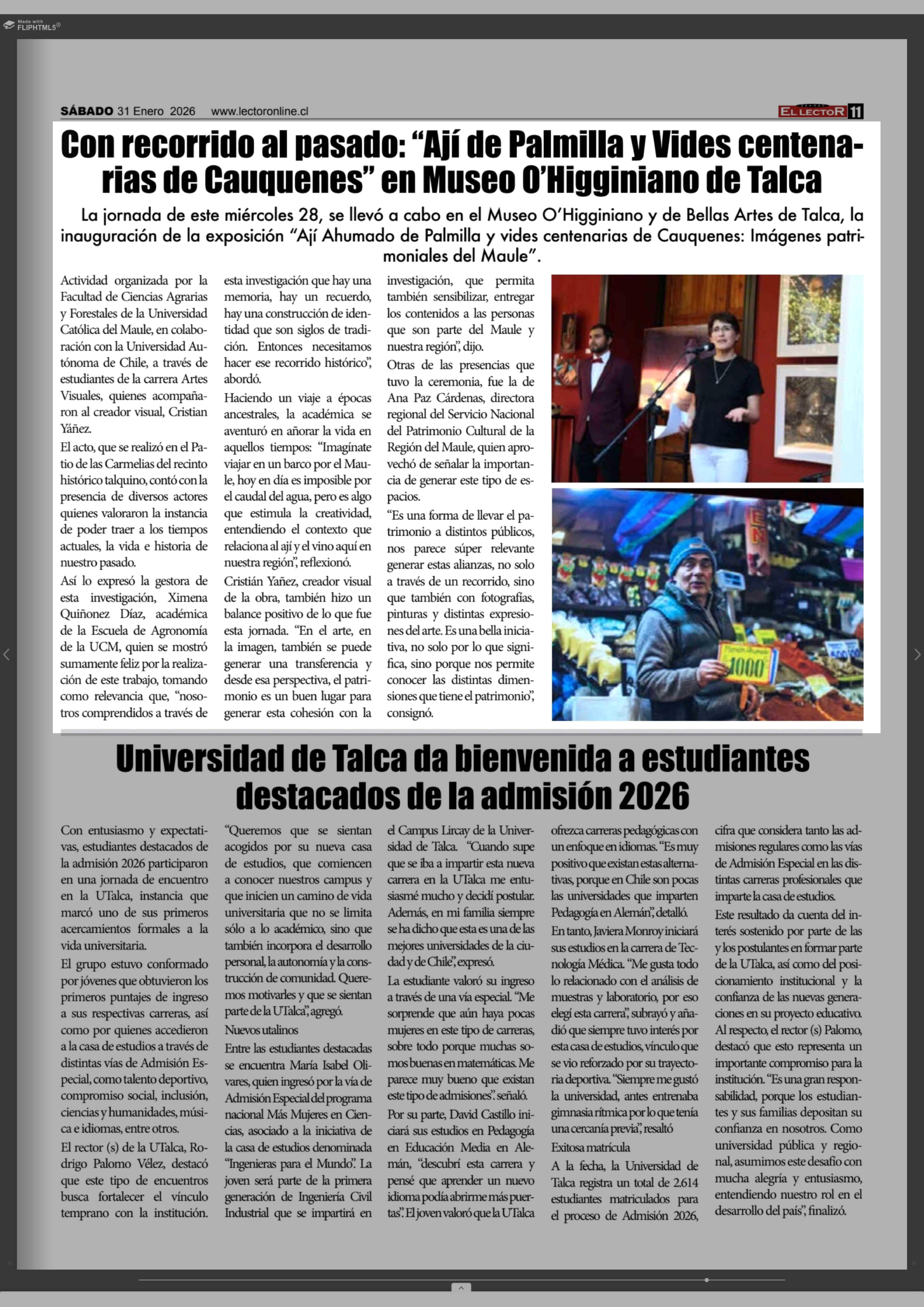 Con recorrido al pasado: "Ají de Palmilla y Vides centenarias de Cauquenes" en Museo O'Higginiano de Talca 31-01-2026 El Lector |