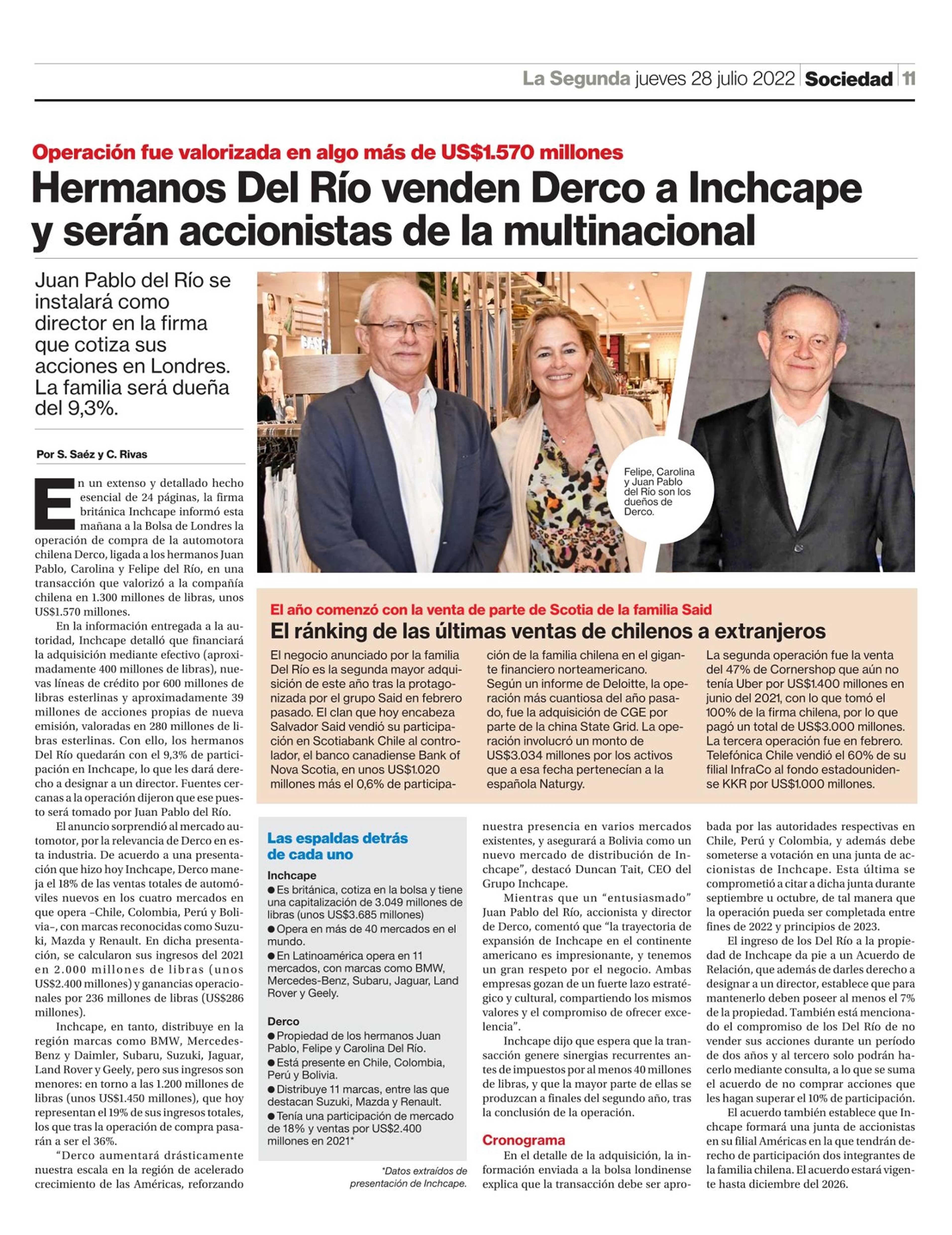 Hermanos Del Río venden Derco a Inchcape y serán accionistas de la multinacional 28-07-2022 La Segunda |