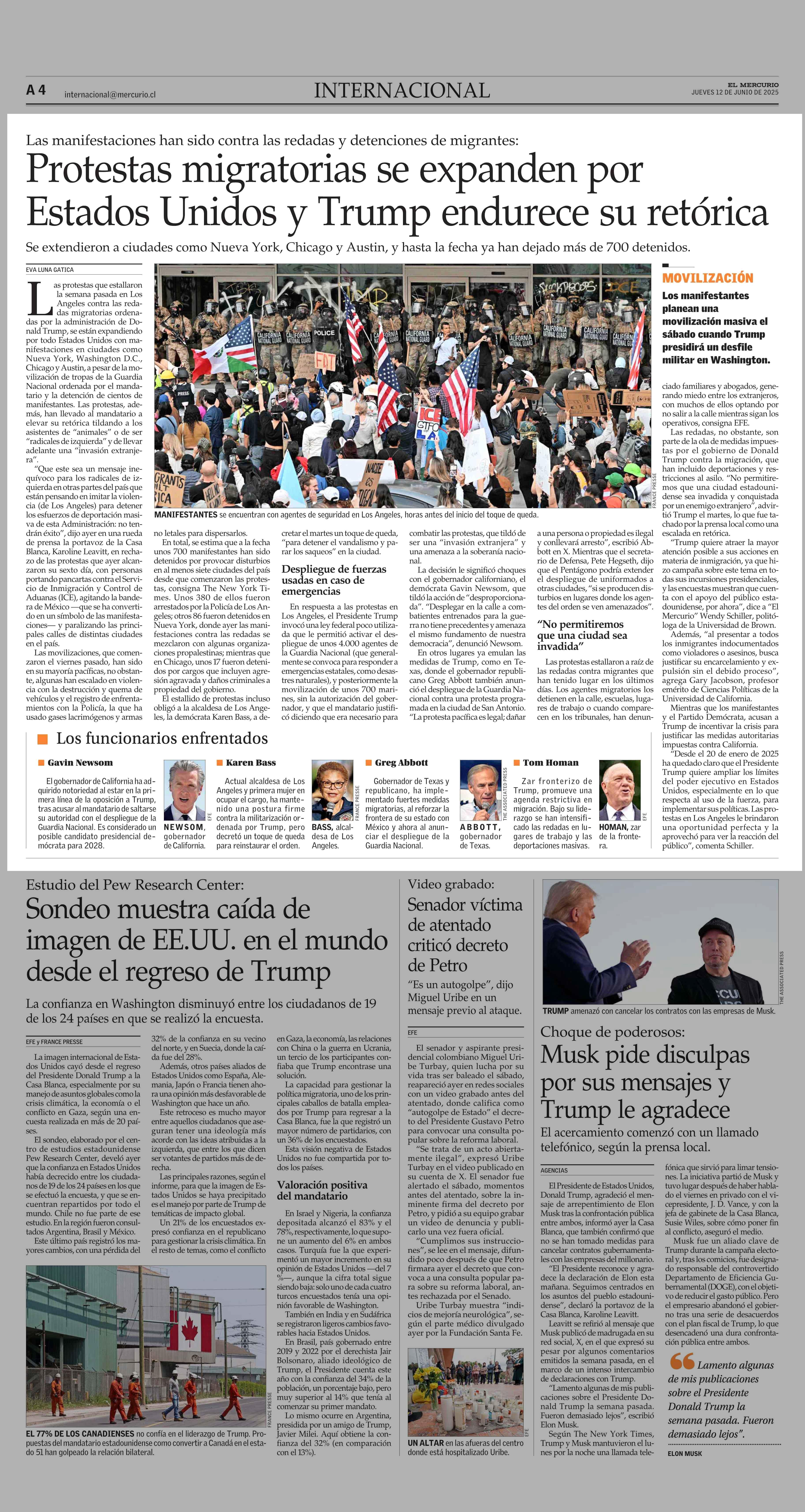 Protestas migratorias se expanden por Estados Unidos y Trump endurece su retórica 12-06-2025 El Mercurio |
