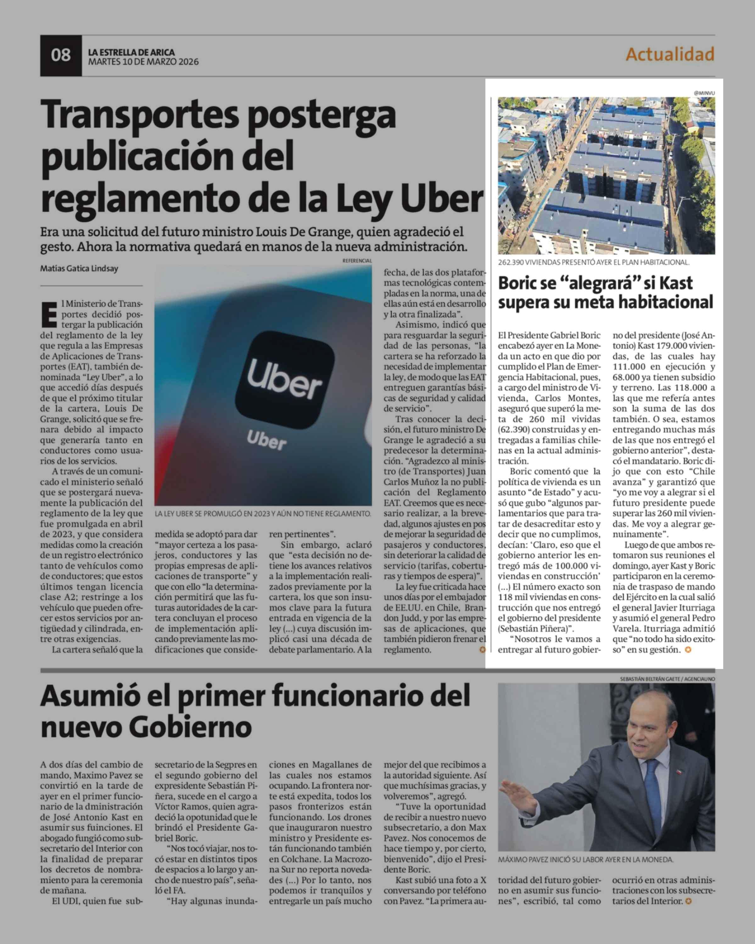 Boric se "alegrará" si Kast supera su meta habitacional 10-03-2026 La Estrella de Arica |