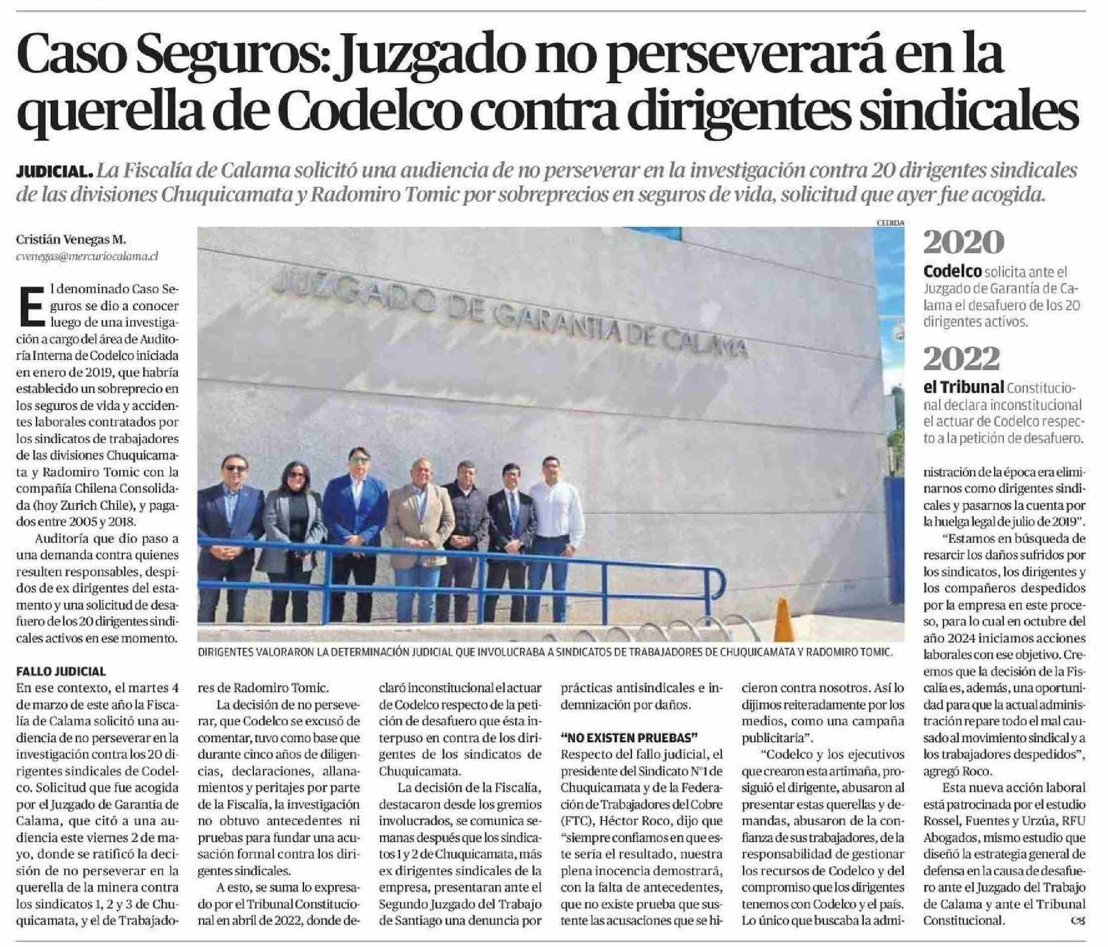 Caso Seguros: Juzgado no perseverará en la querella de Codelco contra dirigentes sindicales 03-05-2025 El Mercurio de Calama |