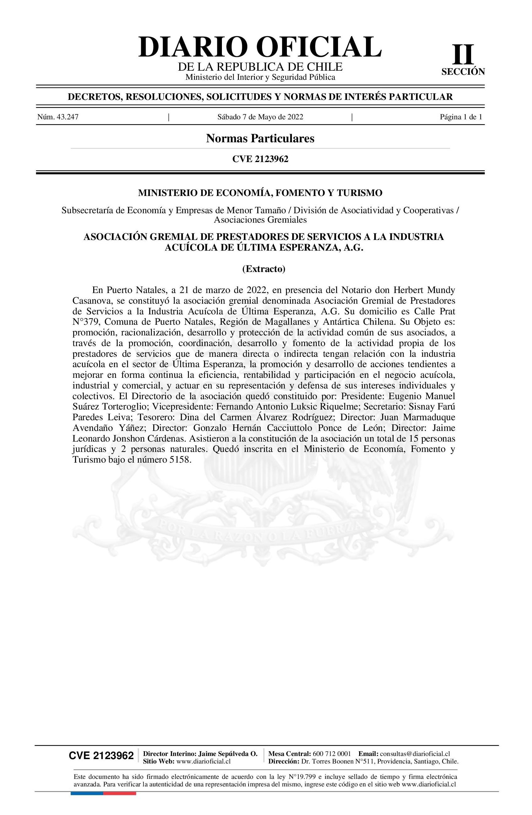 Ministerio de Economía, Fomento Y Turismo Asociación Gremial de Prestadores de Servicios A la Industria Acuícola de Última Esperanza, A.g. 07-05-2022 Diario Oficial Edición Electrónica |
