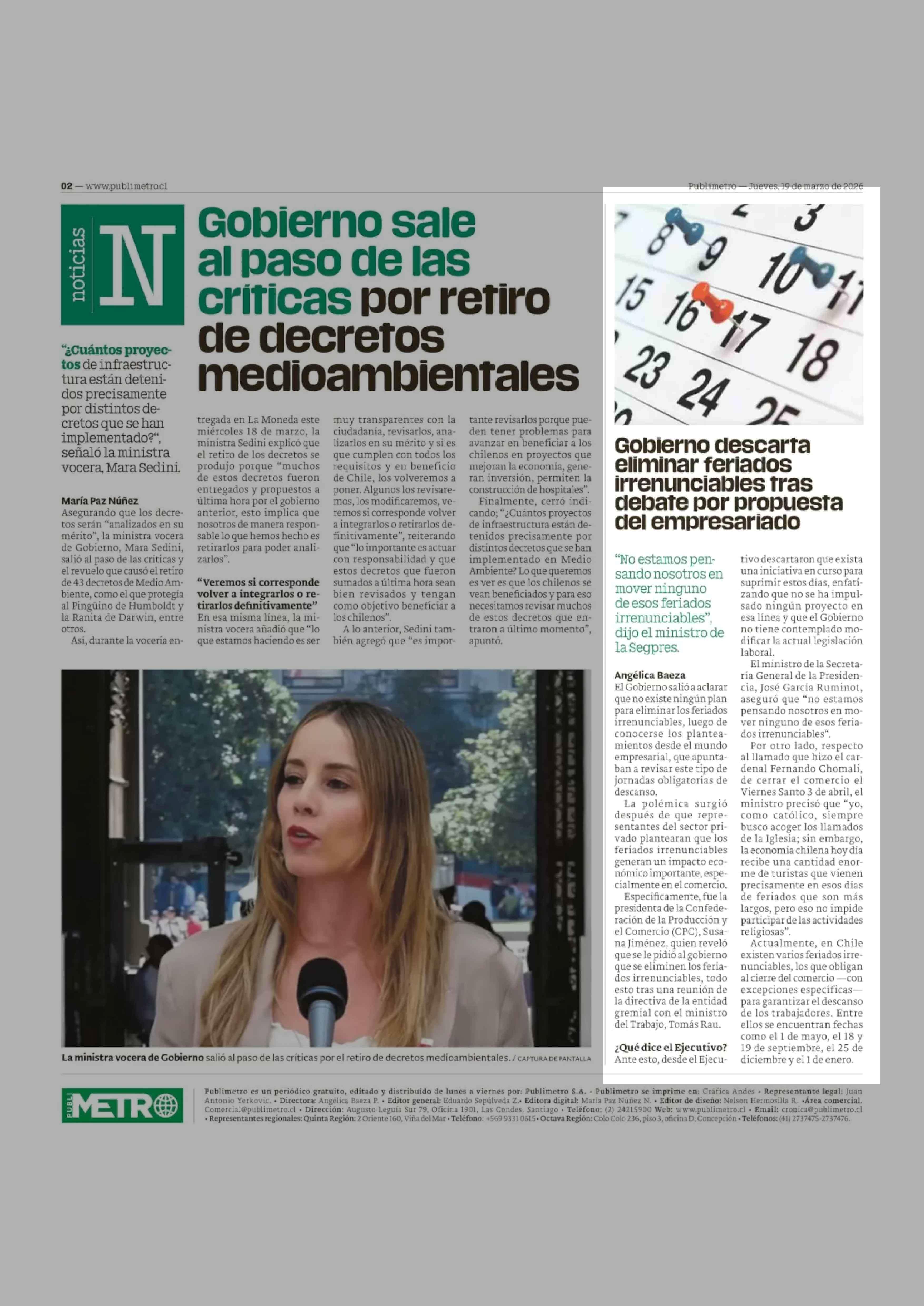 Gobierno descarta eliminar feriados irrenunciables tras debate por propuesta del empresariado 19-03-2026 Publimetro |