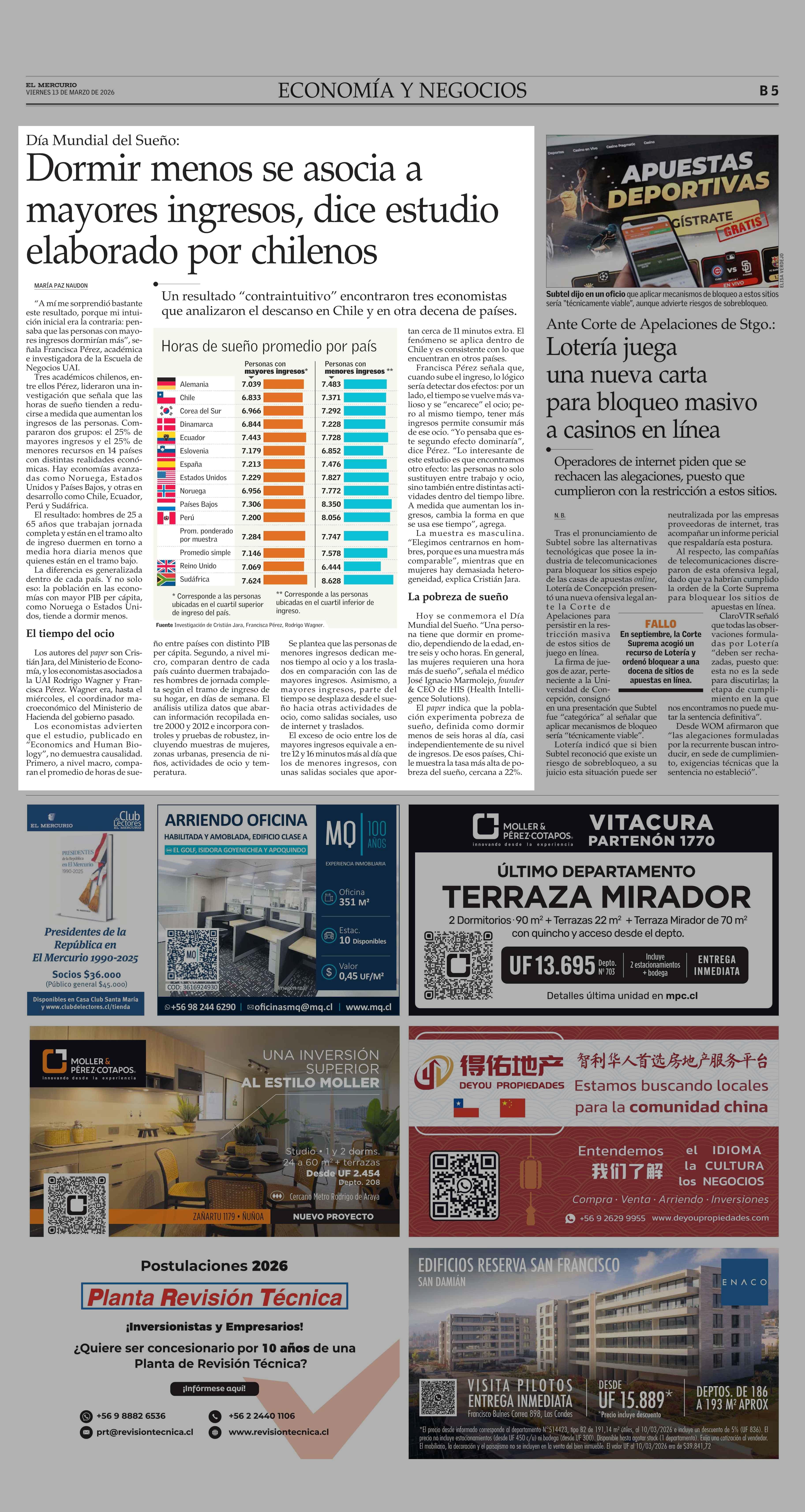 Dormir menos se asocia a mayores ingresos, dice estudio elaborado por chilenos 13-03-2026 El Mercurio |