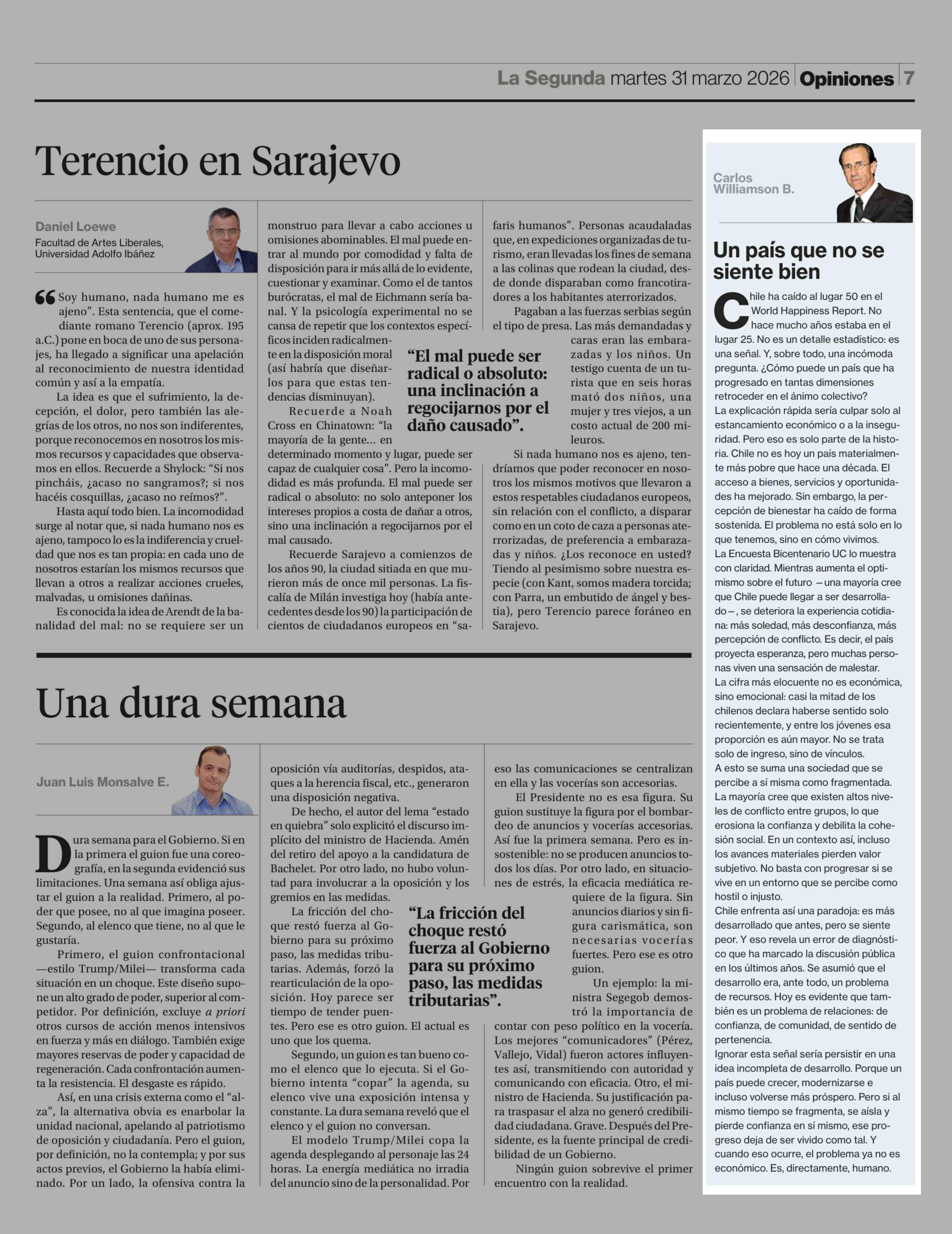 Columnas de Opinión: Un país que no se siente bien 31-03-2026 La Segunda |