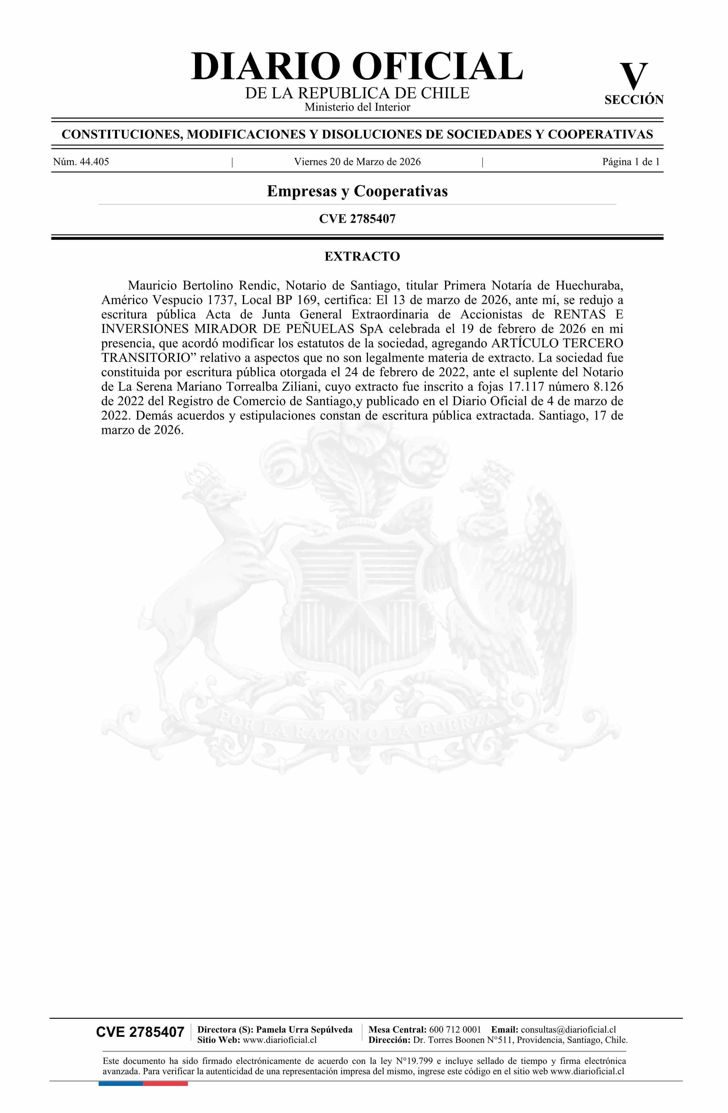 Rentas e Inversiones Mirador de Peñuelas SpA 77.542.394-3* 20-03-2026 Diario Oficial Edición Electrónica |