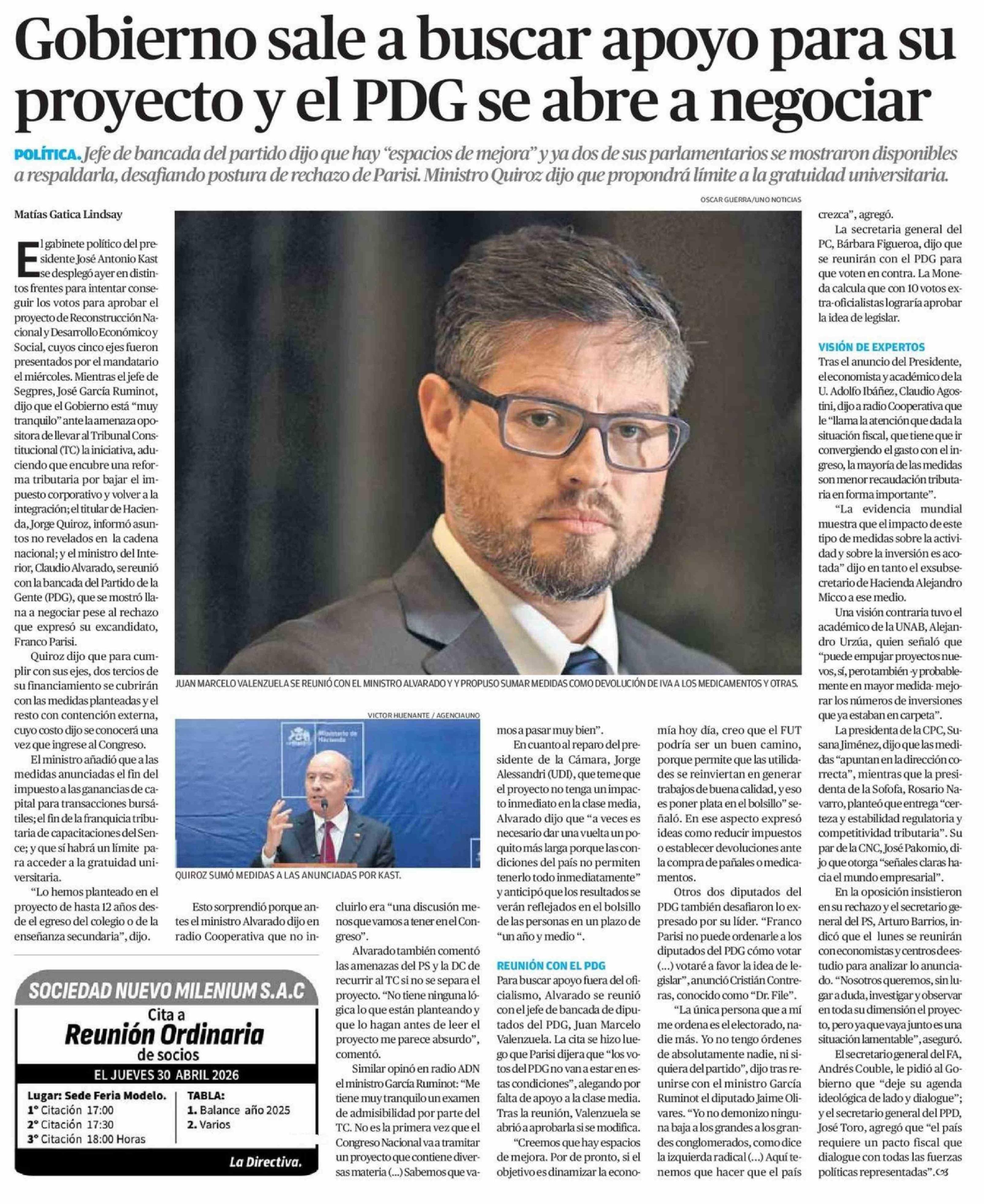 Título: Gobierno sale a buscar apoyo para su proyecto y el PDG se abre a negociar