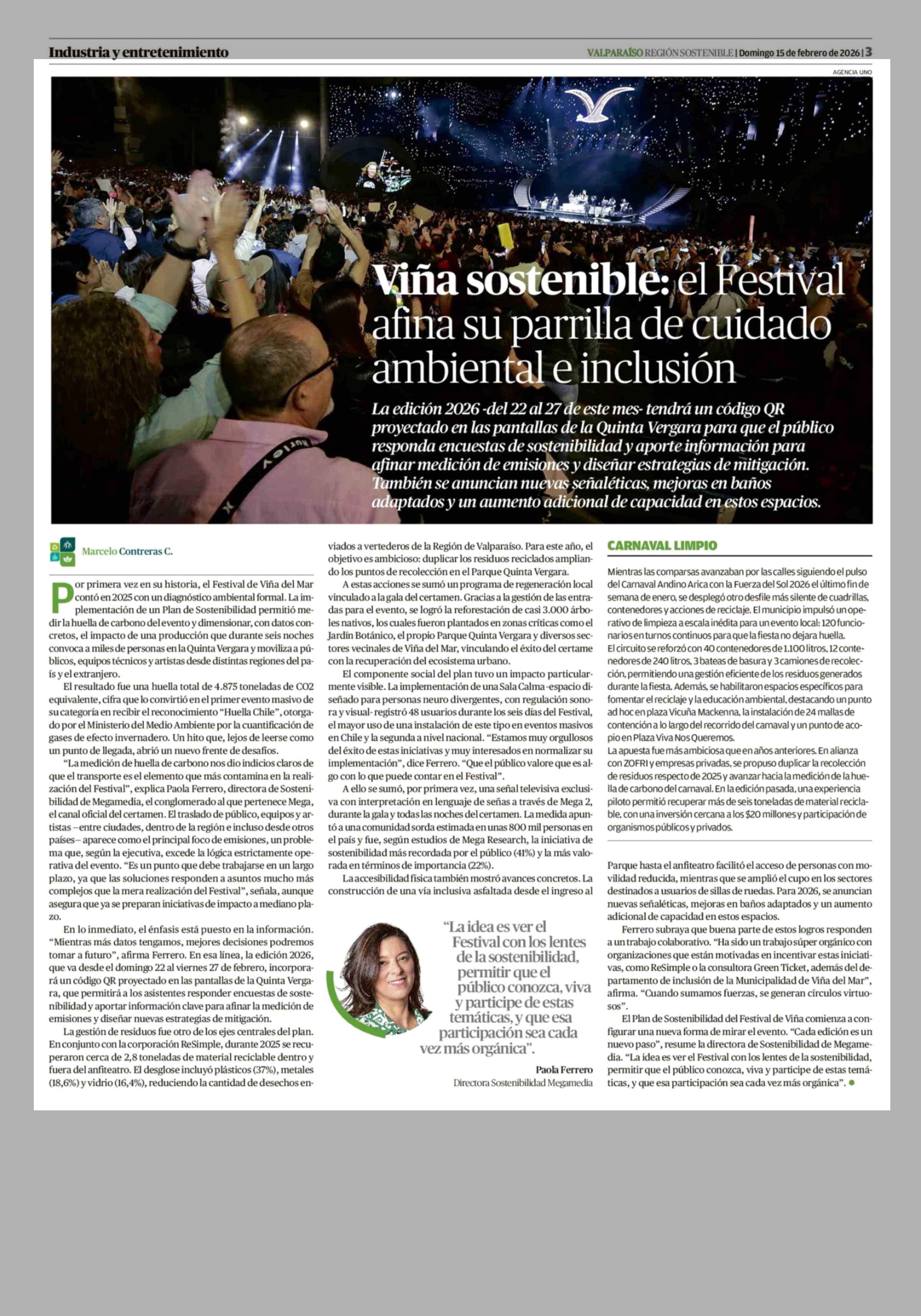 Viña sostenible: el Festival afina su parrilla de cuidado ambiental e inclusión 15-02-2026 El Mercurio de Valparaíso |