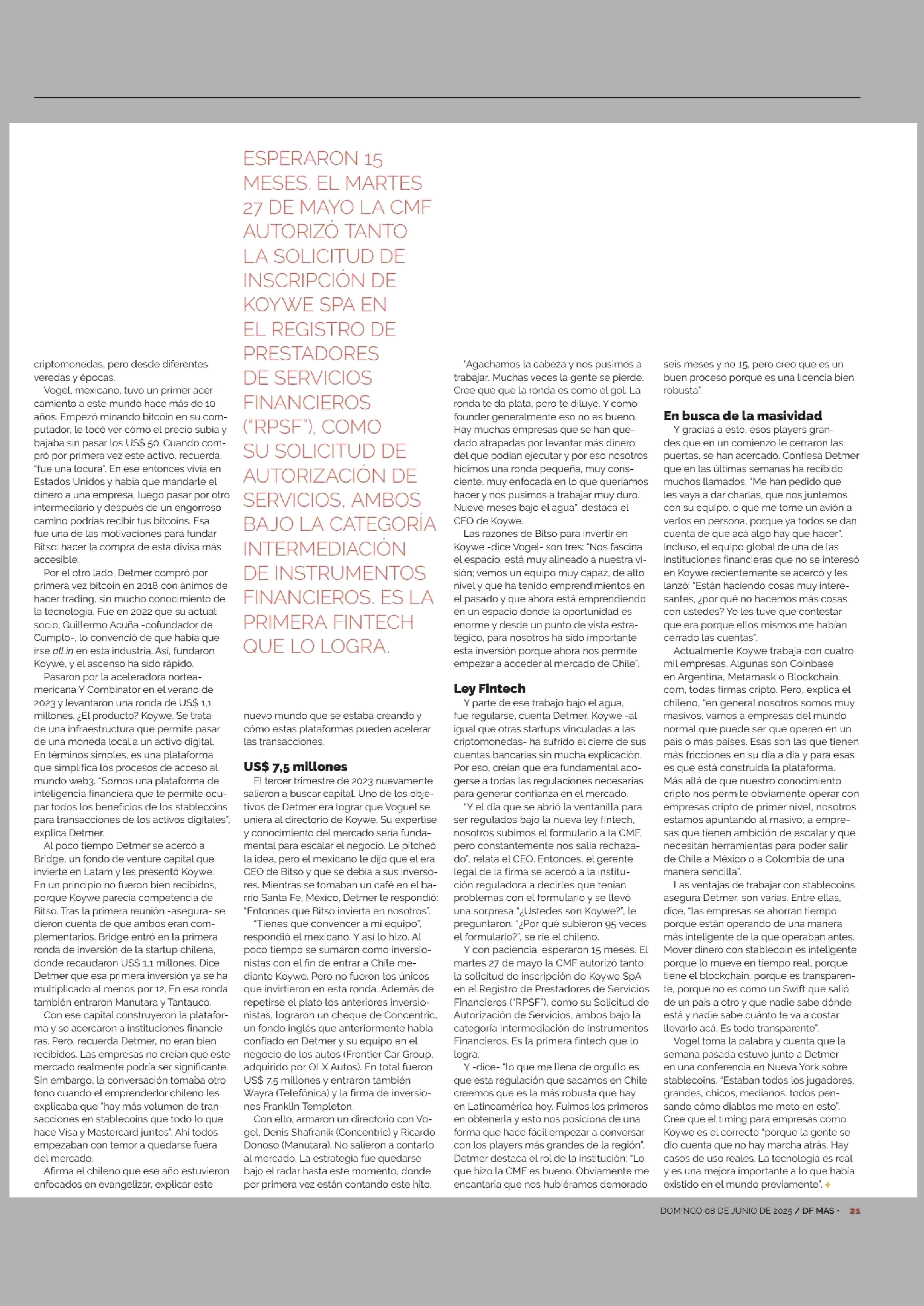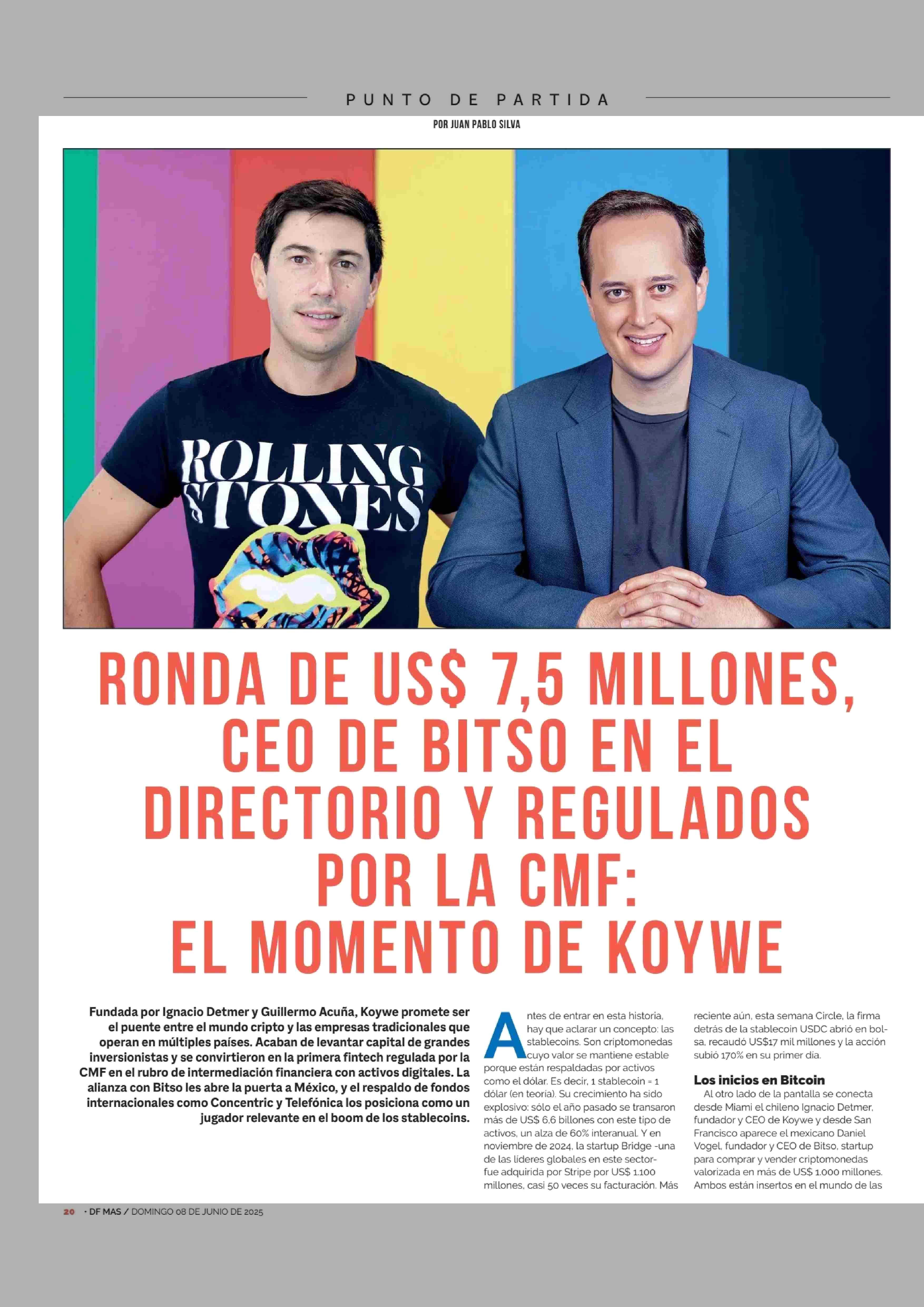 RONDA DE US$ 7,5 MILLONES, CEO DE BITSO EN EL DIRECTORIO Y REGULADOS POR LA CMF: EL MOMENTO DE KOVWE 08-06-2025 Diario Financiero |