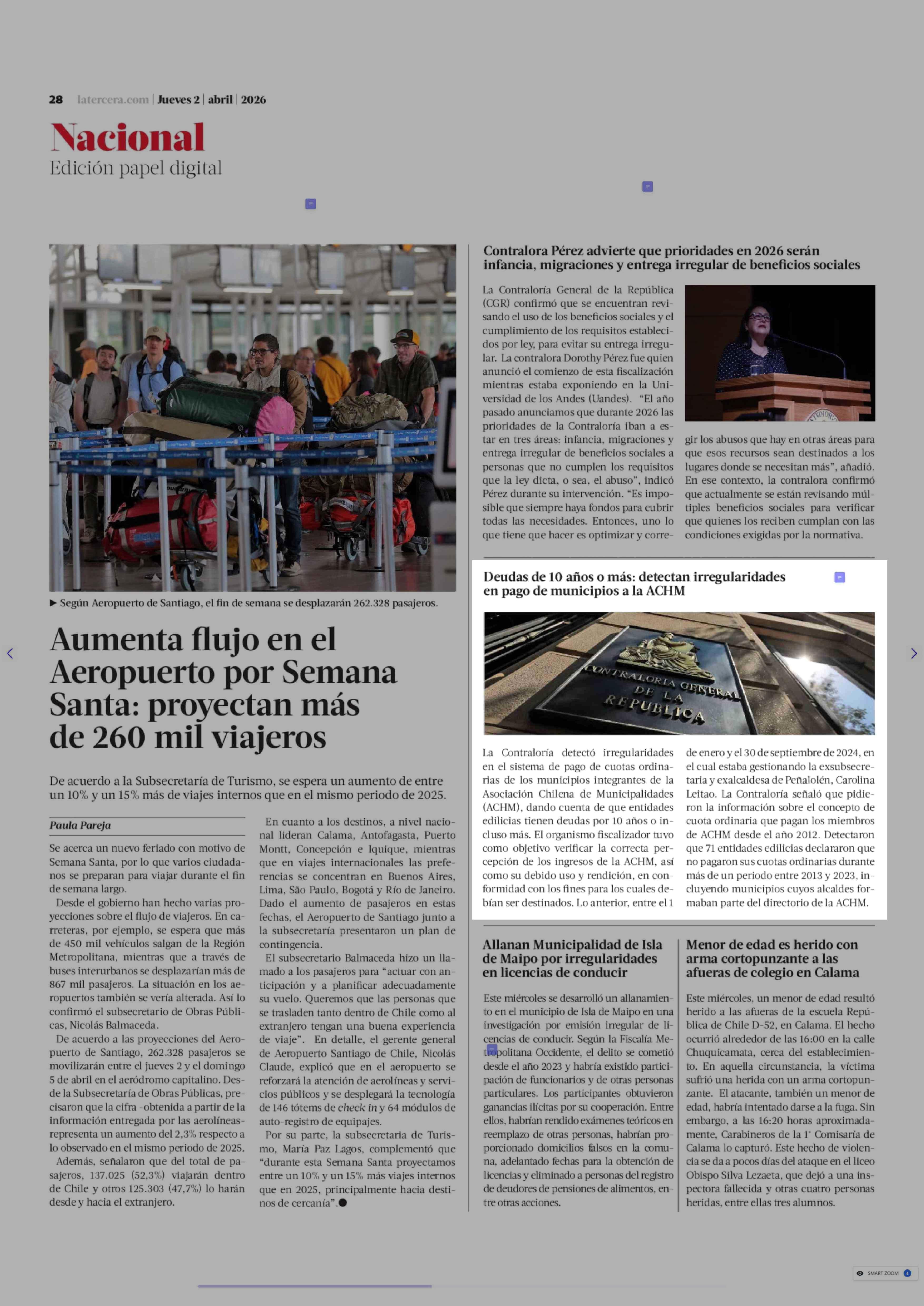 Deudas de 10 años o más: detectan irregularidades en pago de municipios a la ACHM 02-04-2026 La Tercera |