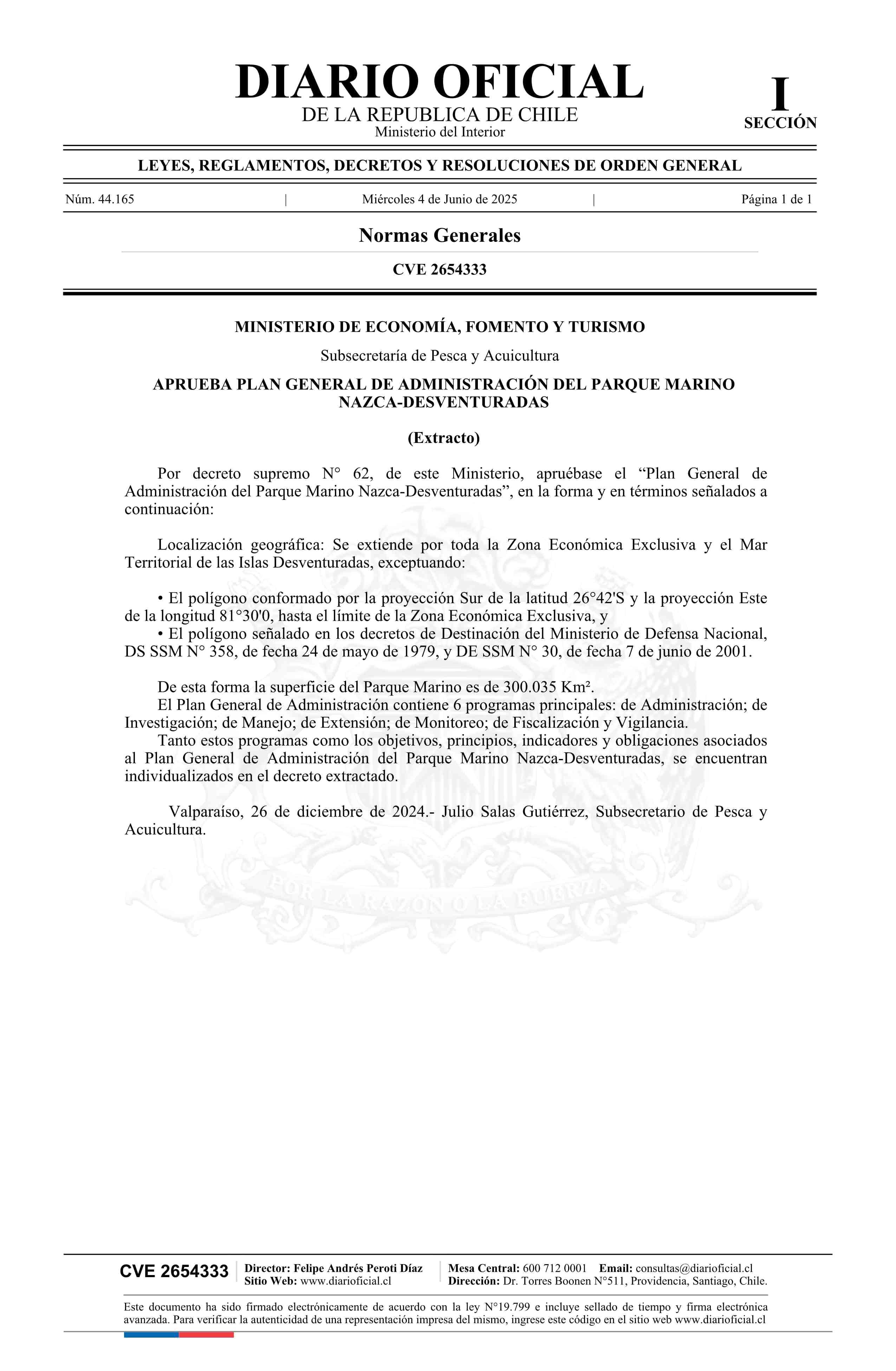 Extracto de decreto número 62, de 2024.- Aprueba Plan General de Administración del Parque Marino Nazca-Desventuradas 04-06-2025 Diario Oficial Edición Electrónica |