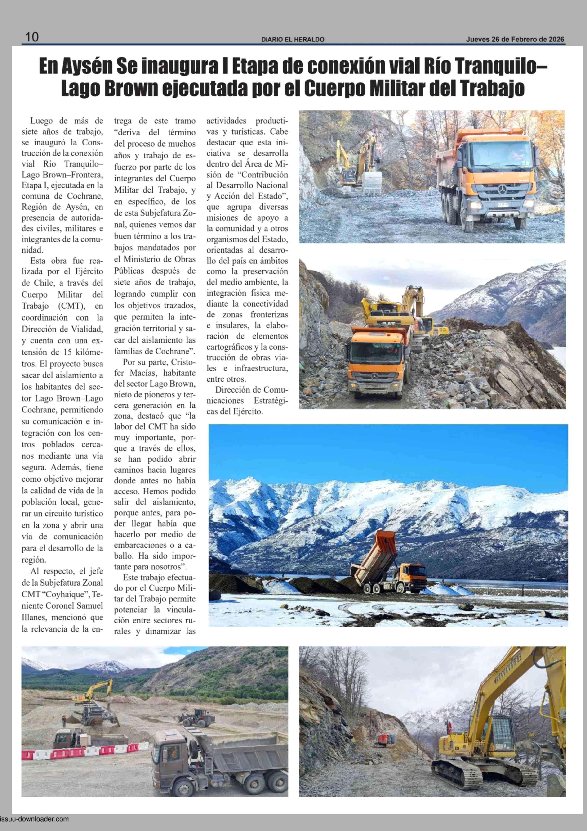 Título: En Aysén Se inaugura I Etapa de conexión vial Río TranquiloLago Brown ejecutada por el Cuerpo Militar del Trabajo