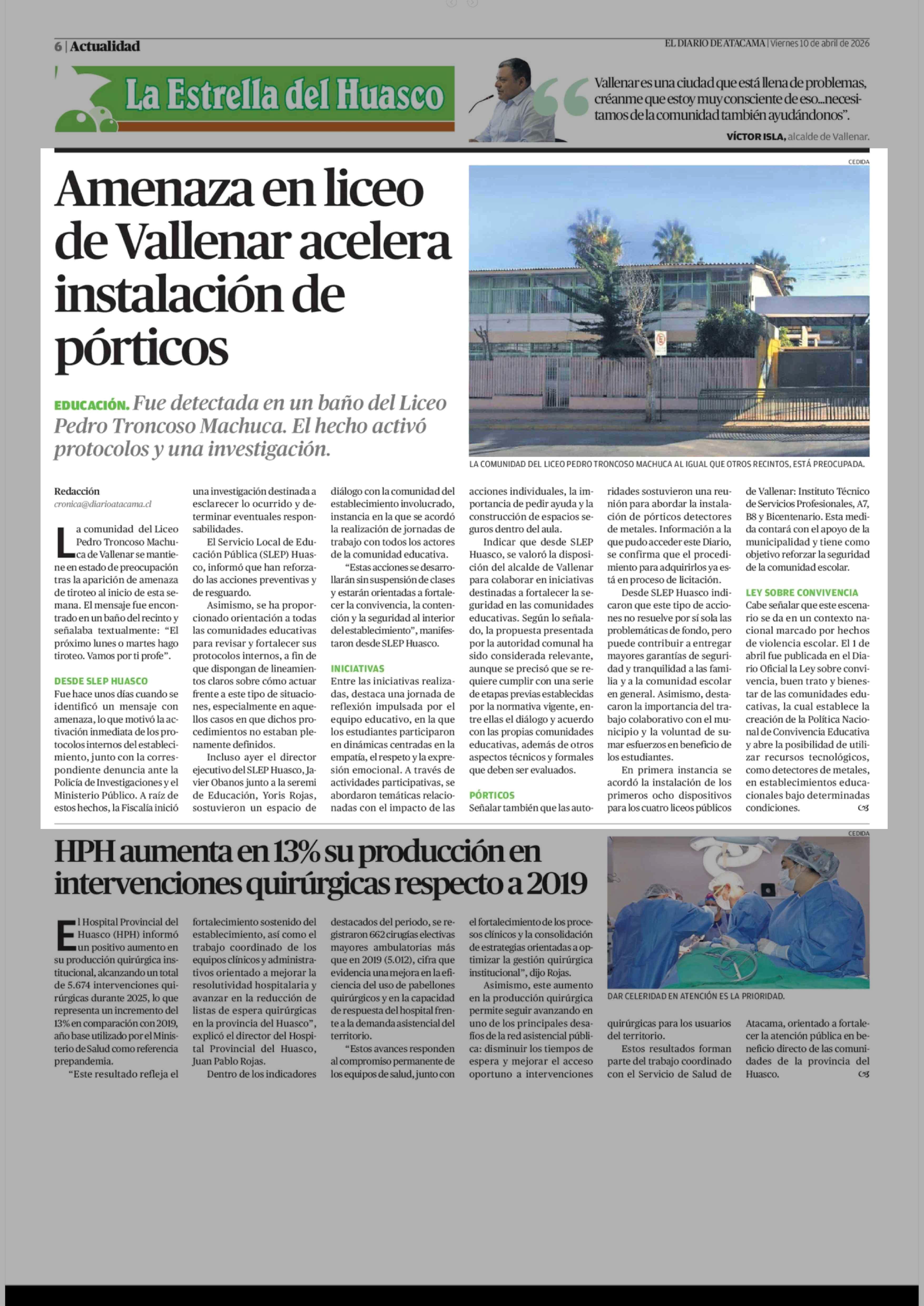 | Título: | Amenaza en liceo de Vallenar acelera instalación de pórticos |