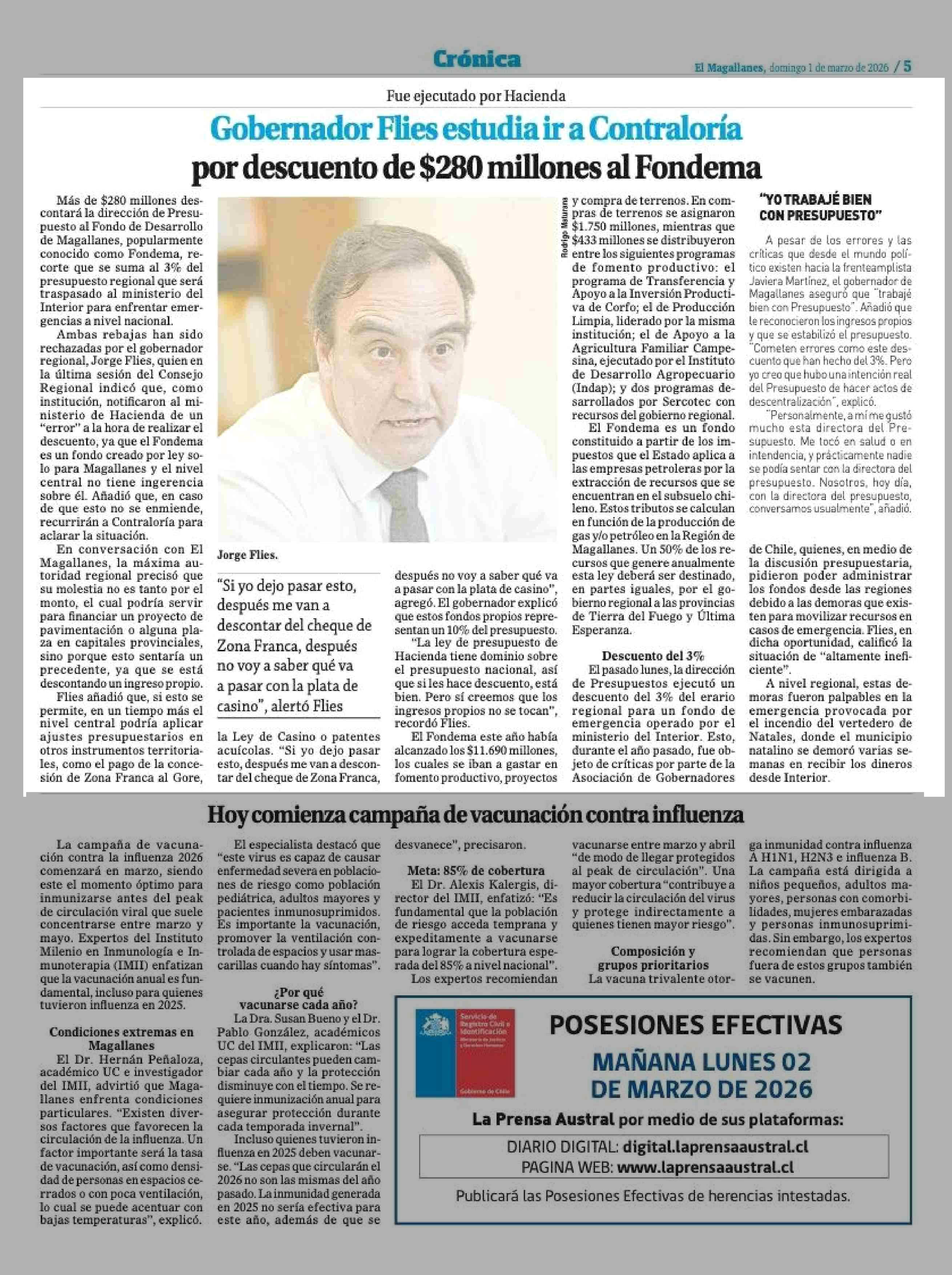Gobernador Flies estudia ir a Contraloría por descuento de $280 millones al Fondema 01-03-2026 El Magallanes |