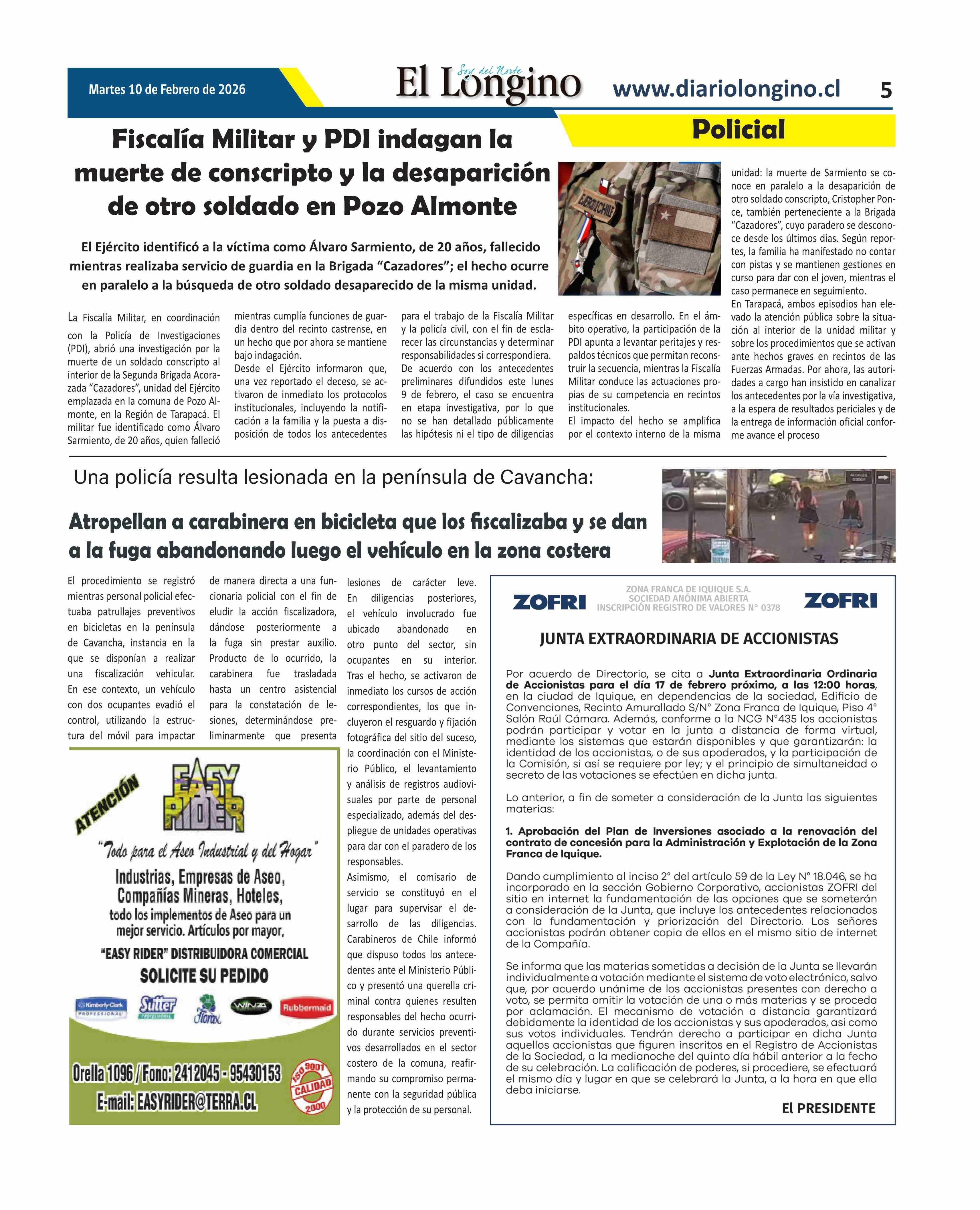 Fiscalía Militar y PD] indagan la muerte de conscripto y la desaparición de otro soldado en Pozo Almonte 10-02-2026 El Longino |