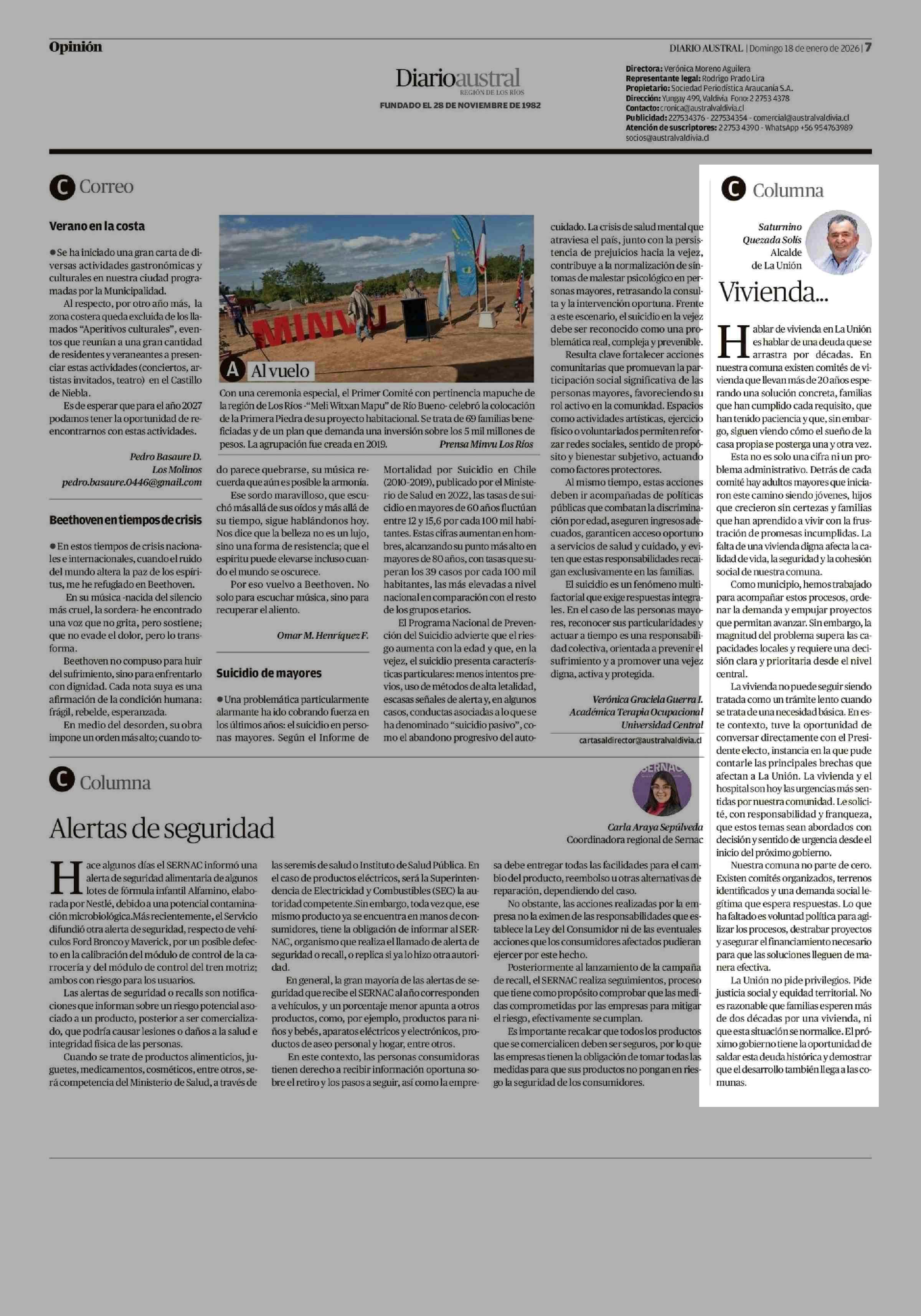 Columnas de Opinión: Vivienda ... 18-01-2026 Diario Austral Región de Los Ríos |