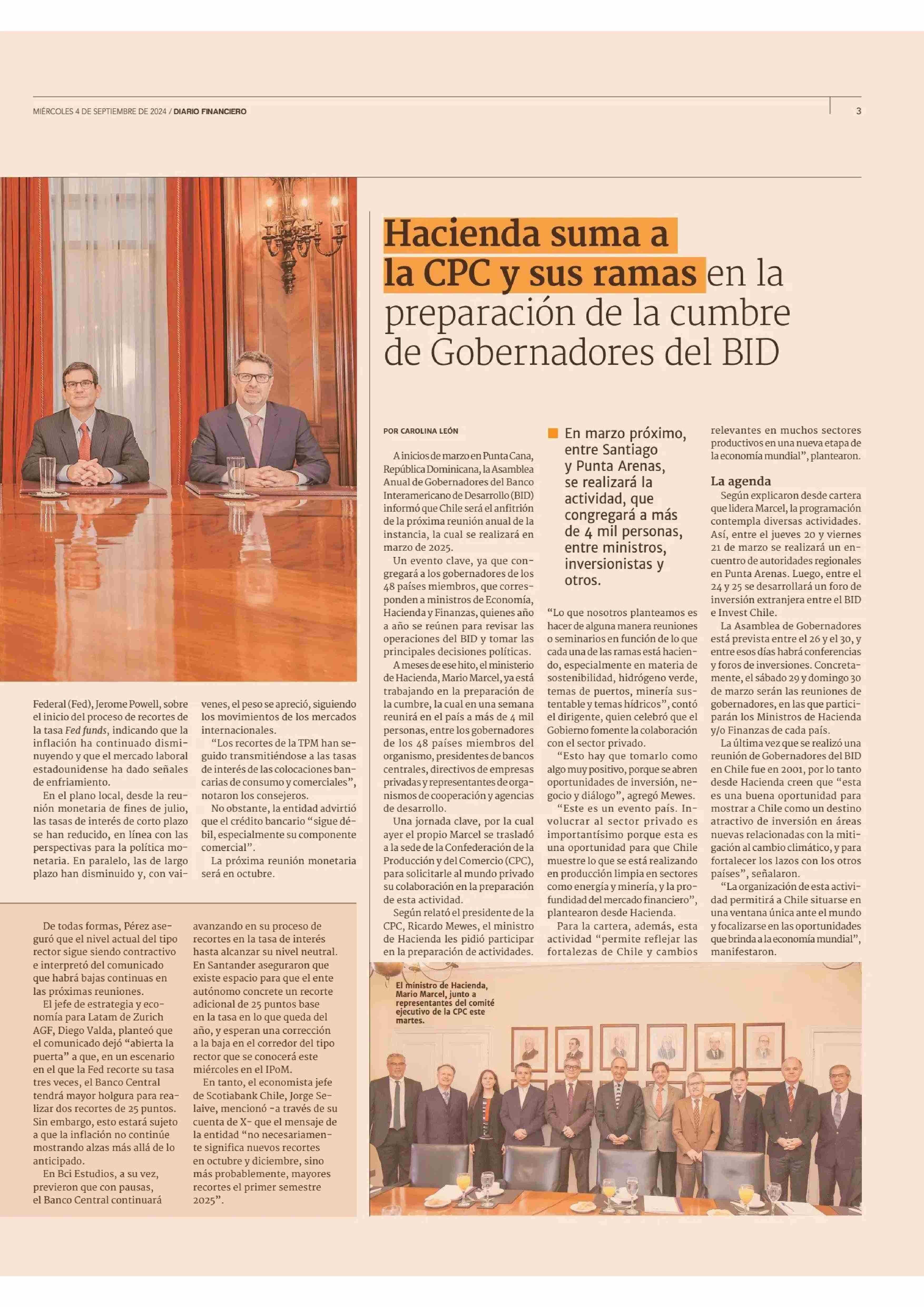 Hacienda suma a la CPC y sus ramas en la preparación de la cumbre de Gobernadores del BID 04-09-2024 Diario Financiero |