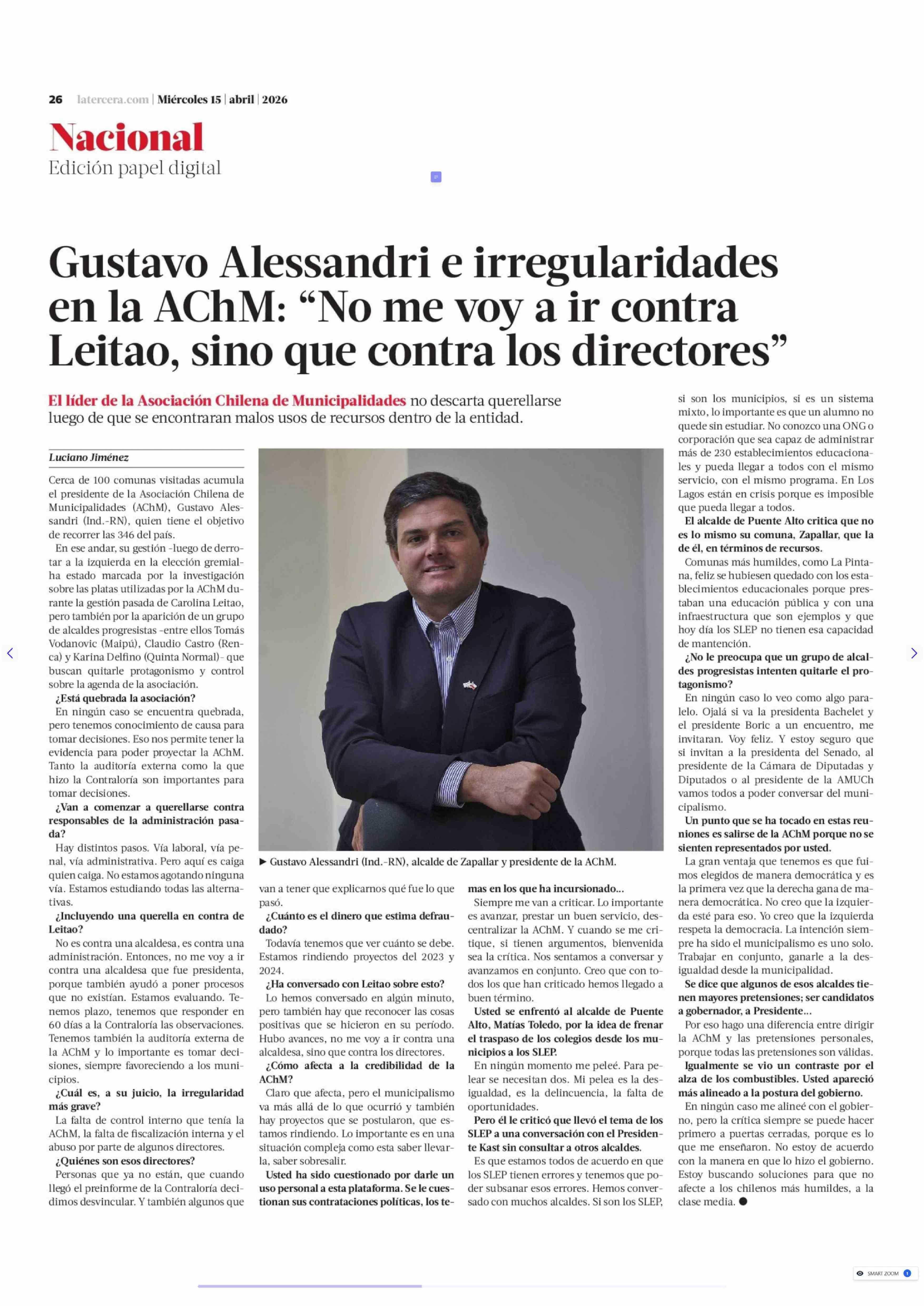 Gustavo Alessandri e irregularidades en la AChM: "No me voy a ir contra Leitao, sino que contra los directores" 15-04-2026 La Tercera |