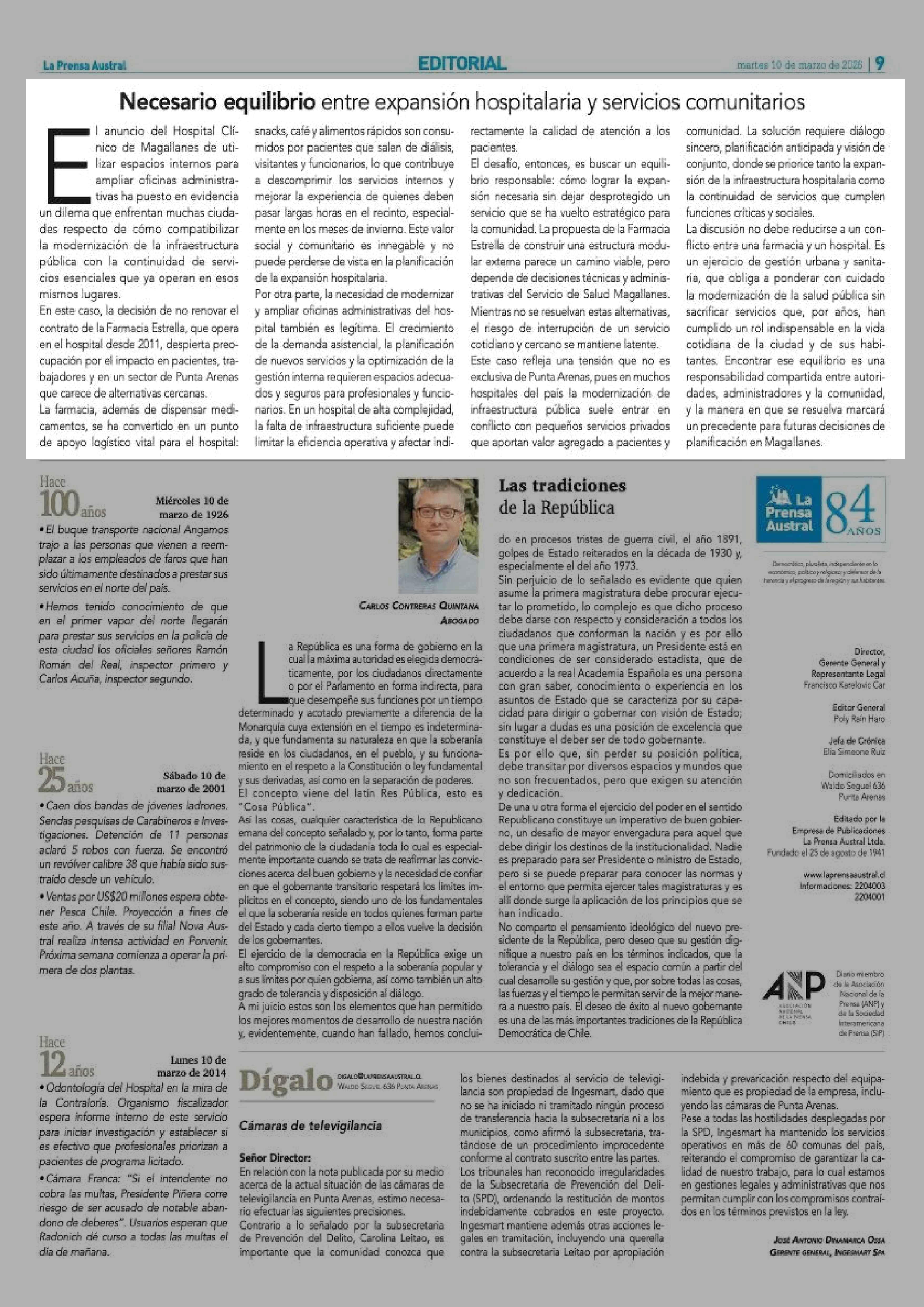 Editorial: Necesario equilibrio entre expansión hospitalaria y servicios comunitarios 10-03-2026 La Prensa Austral |