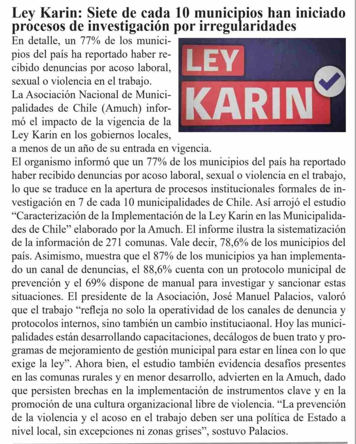 Ley Karin: Siete de cada 10 municipios han iniciado procesos de investigación por irregularidades 08-06-2025 El Heraldo |