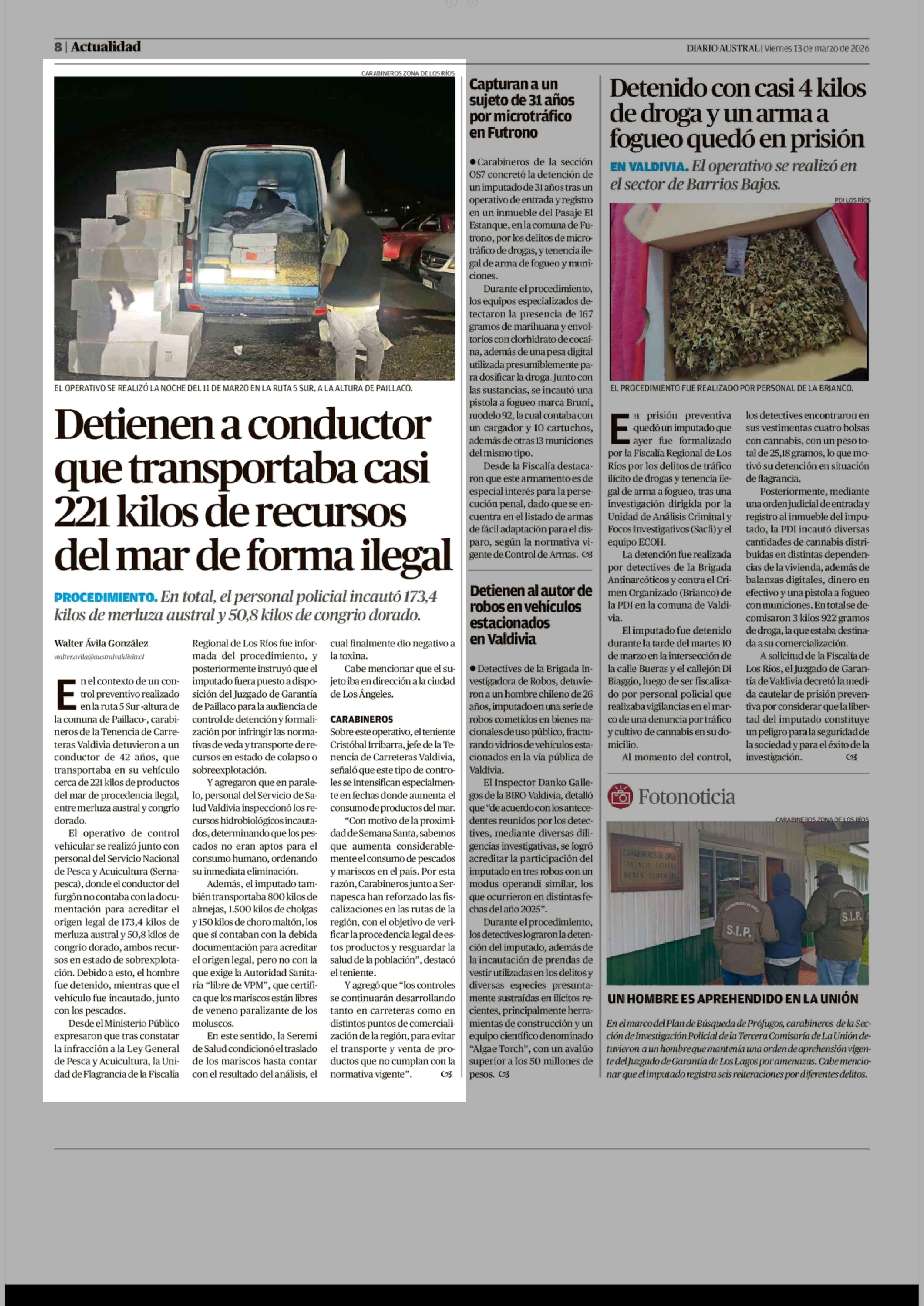 Detienen a conductor que transportaba casi 221 kilos de recursos del mar de forma ilegal 13-03-2026 Diario Austral Región de Los Ríos |