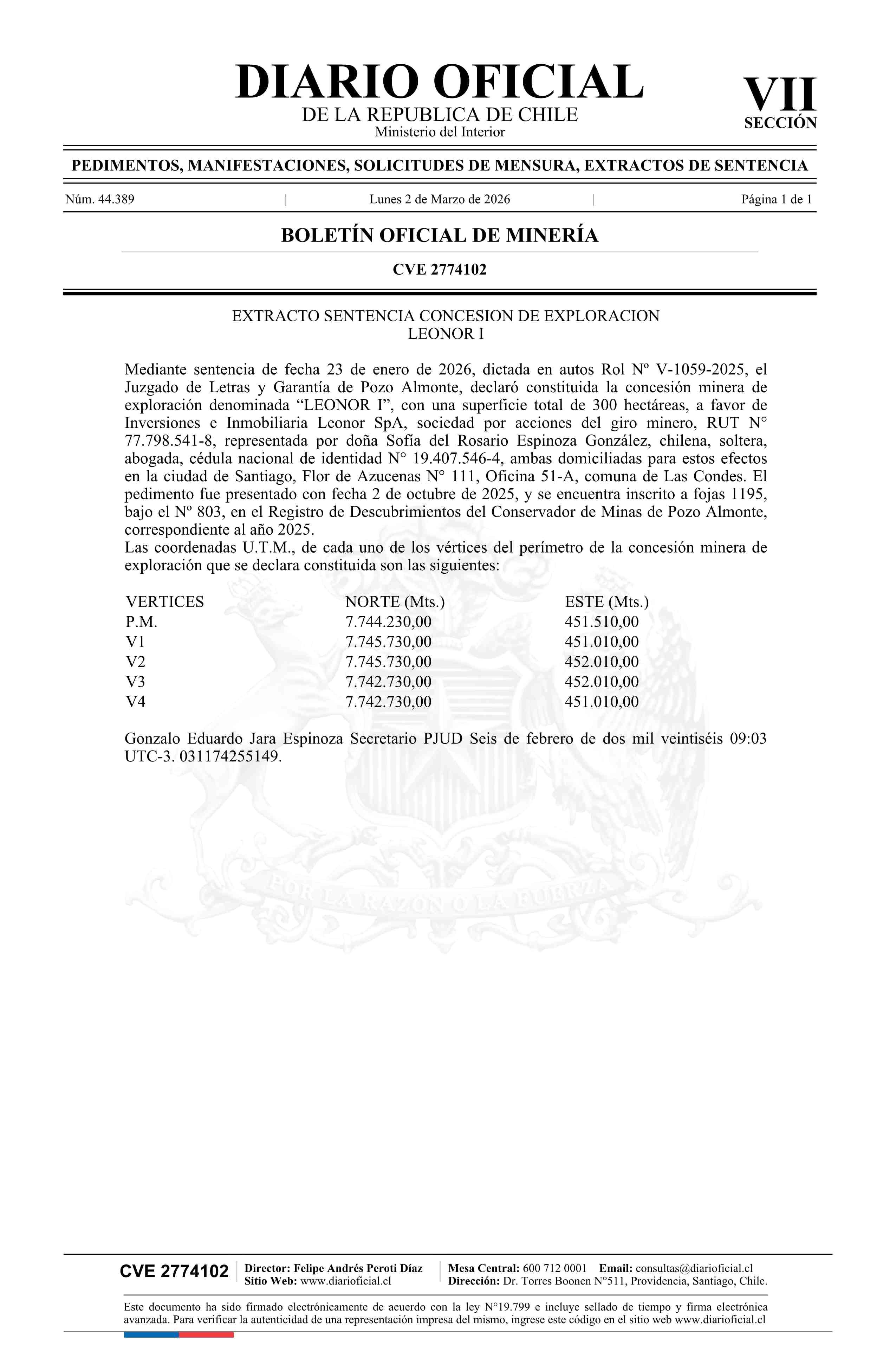 LEONOR I / Inversiones e Inmobiliaria Leonor SpA 02-03-2026 DIARIO OFICIAL CHILE - BOLETÍN OFICIAL DE MINERÍA |