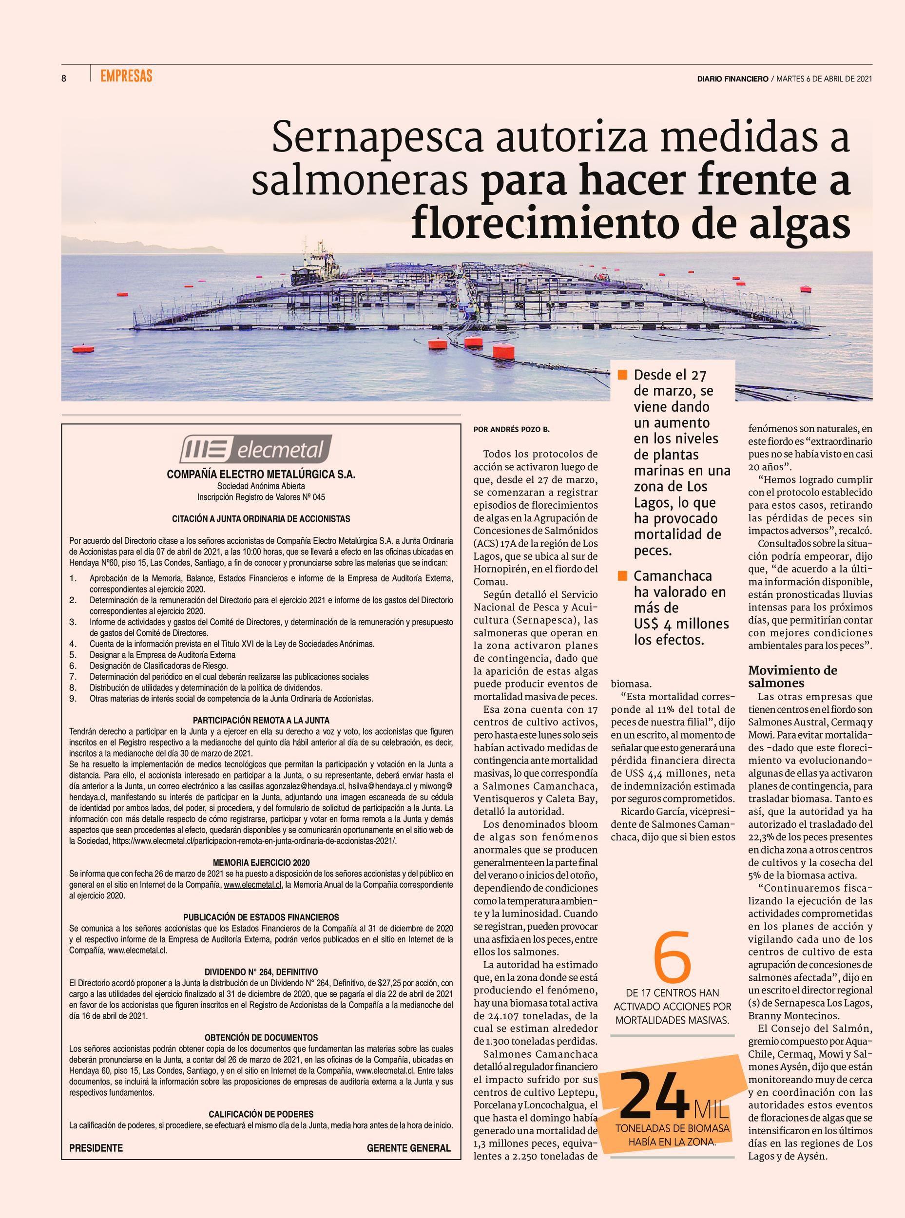 Sernapesca autoriza medidas a salmoneras para hacer frente a florecimiento de algas 06-04-2021 Diario Financiero |