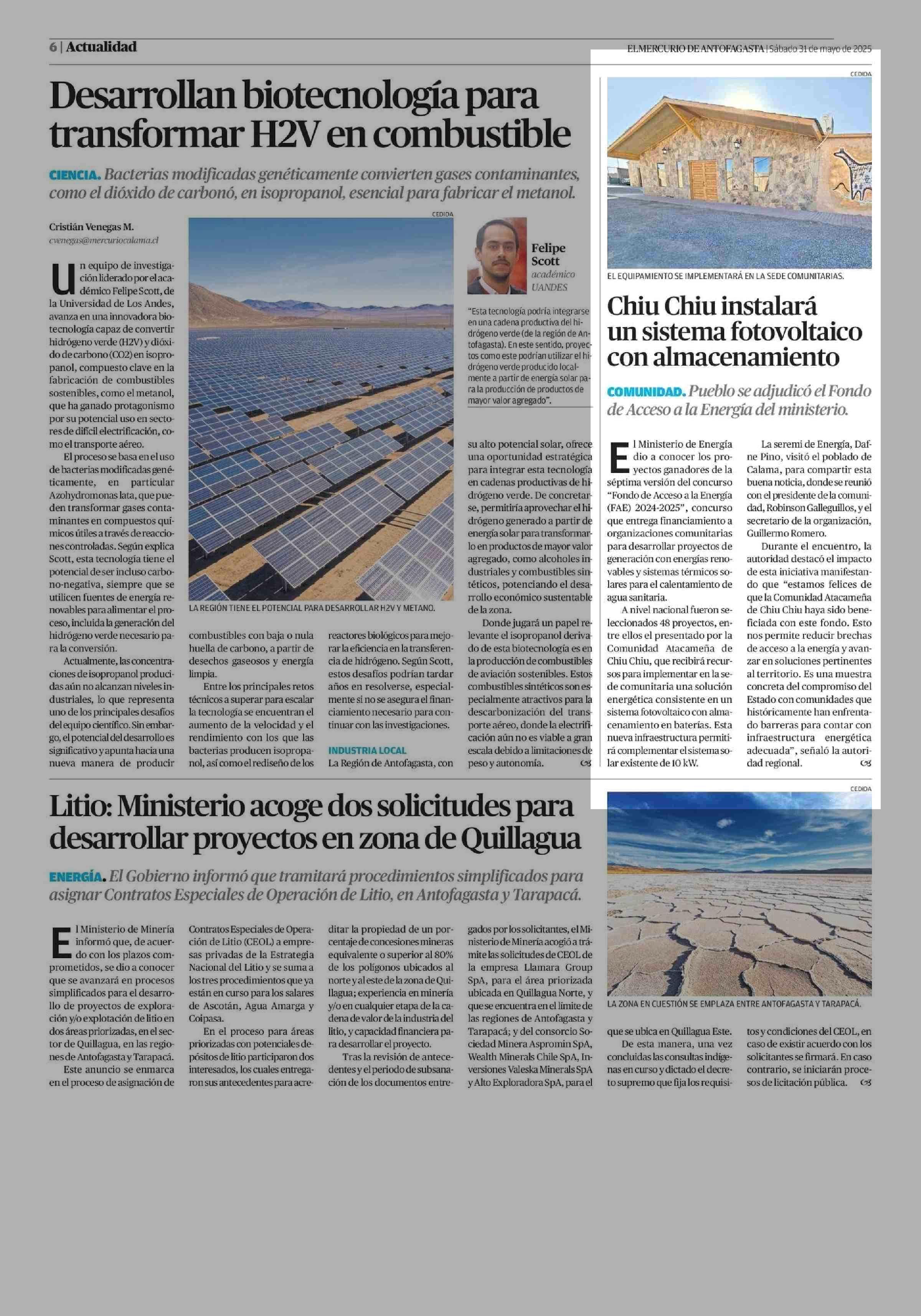 Chiu Chiu instalará un sistema fotovoltaico con almacenamiento 31-05-2025 El Mercurio de Antofagasta |