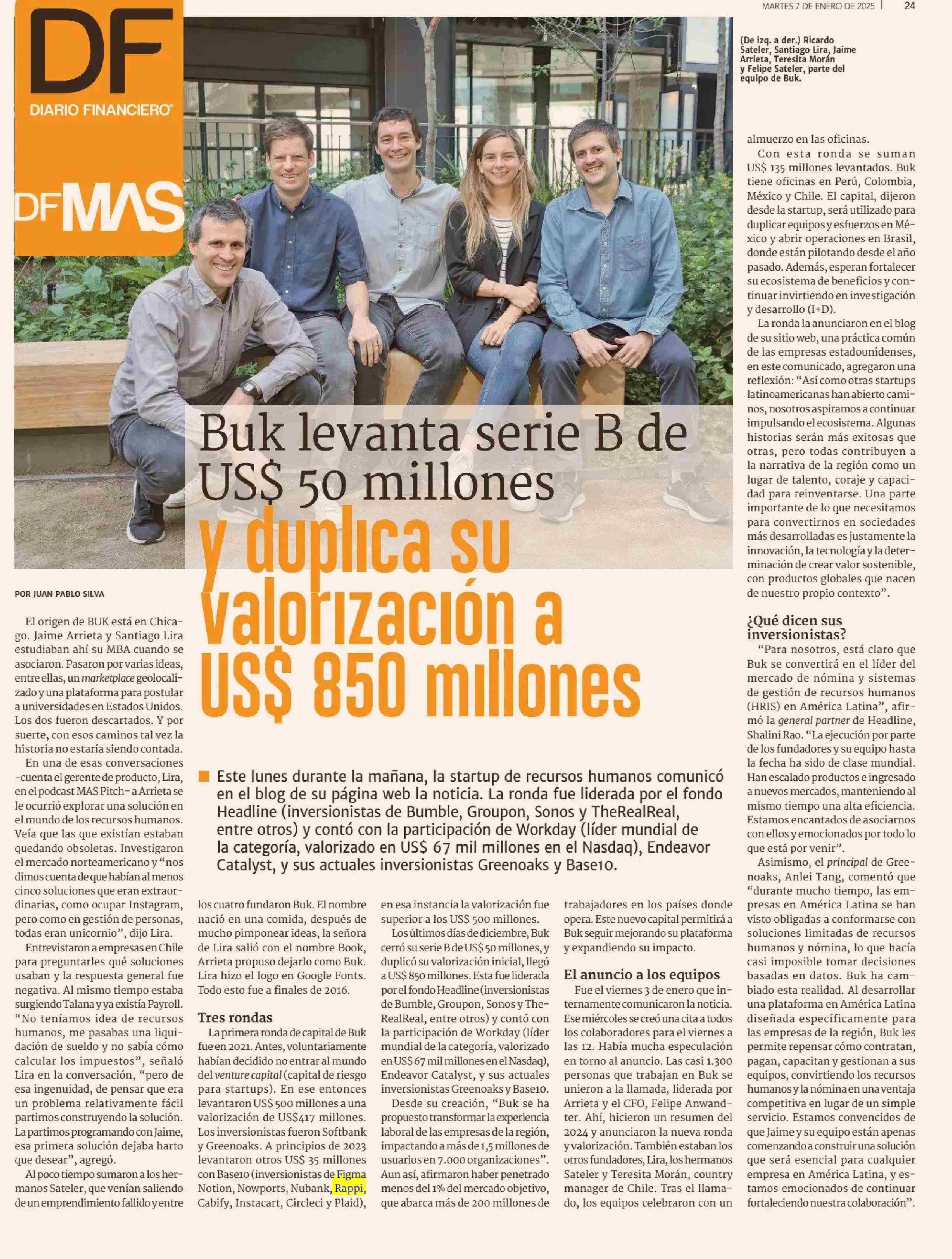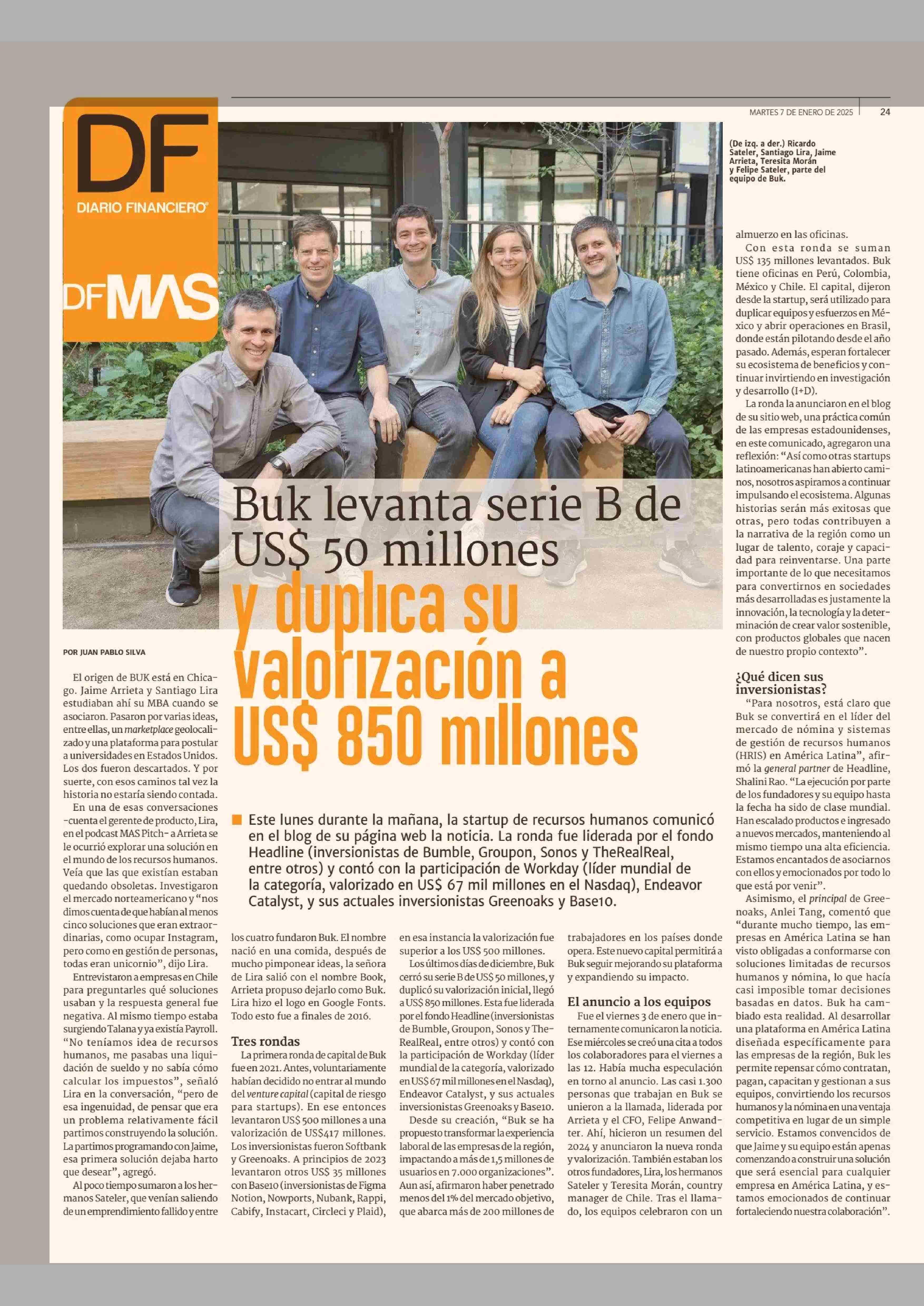 Buk levanta serie B de 'US$ 50 millones y duplica su valorizacion a US$ 850 Millones 07-01-2025 Diario Financiero |