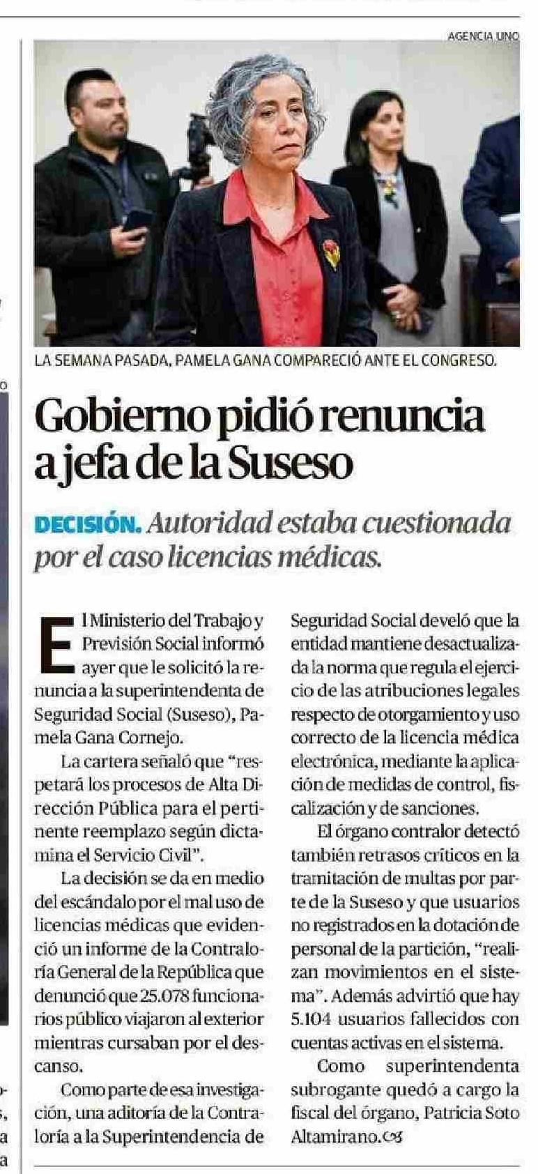 | Título: | Gobierno pidió renuncia a jefa de la Suseso |