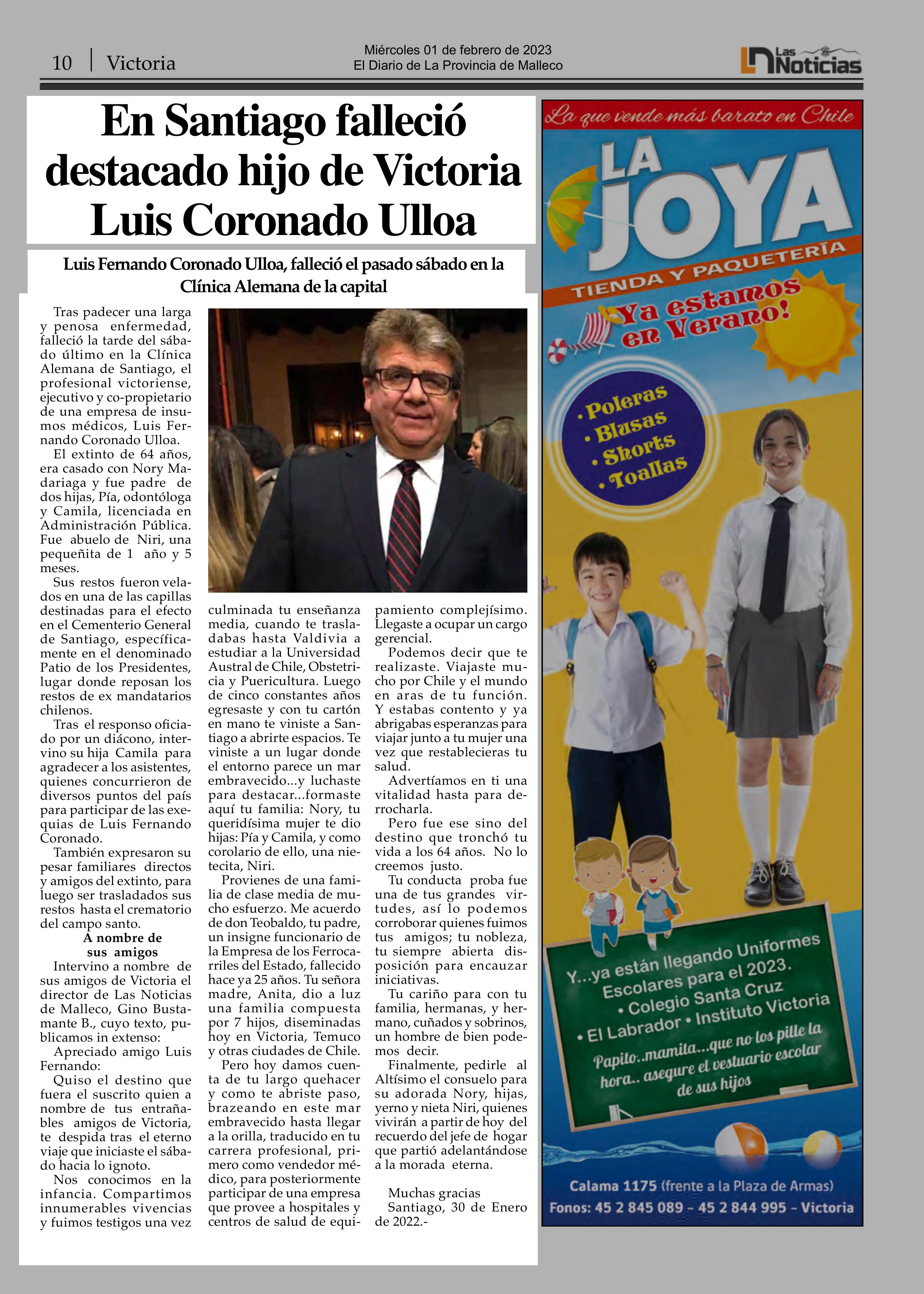 En Santiago falleció destacado hijo de Victoria Luis Coronado Ulloa 01-02-2023 Las Noticias |