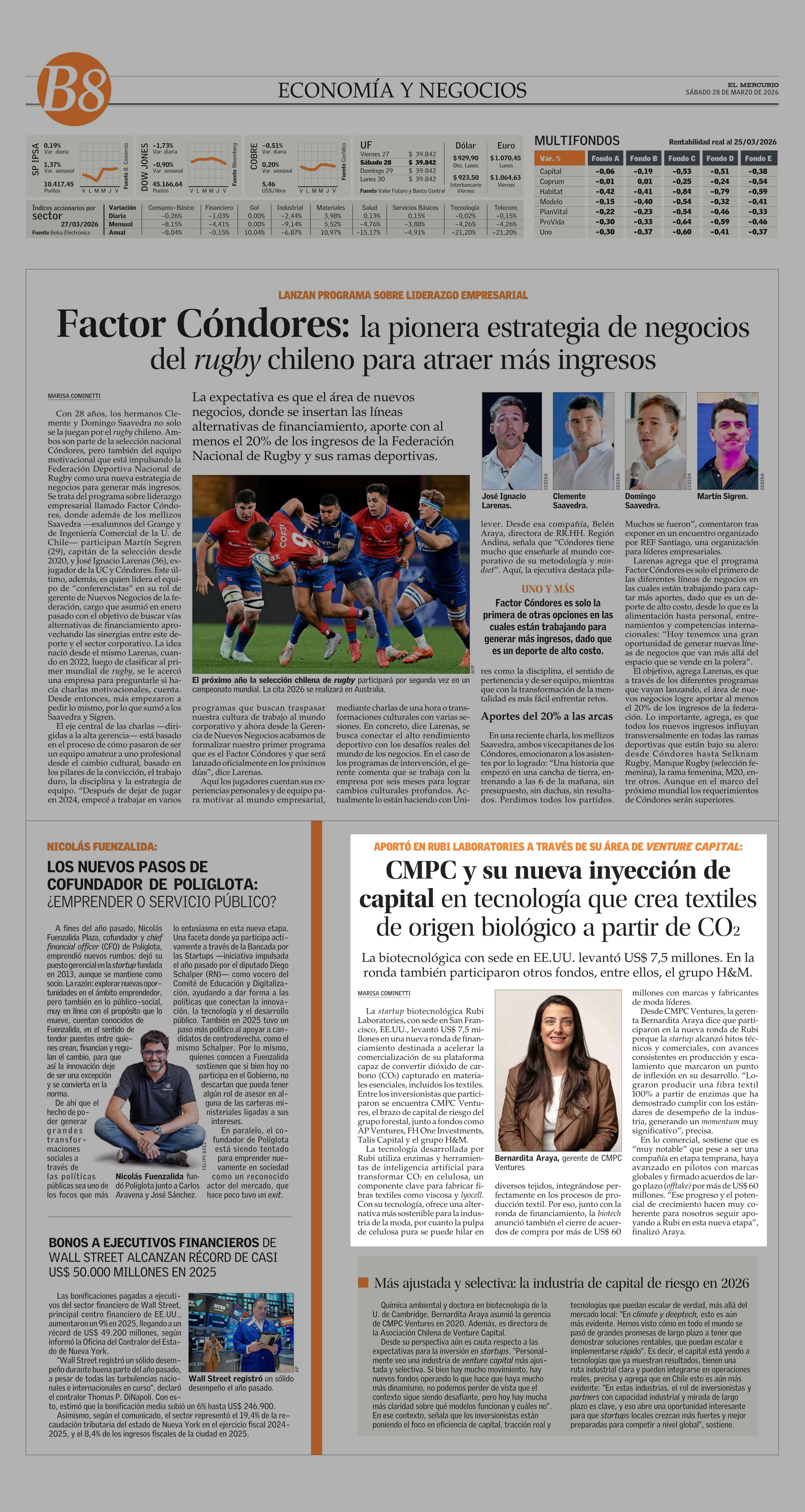 CMPC y su nueva inyección de capital en tecnología que crea textiles de origen biológico a partir de CO2 28-03-2026 El Mercurio |